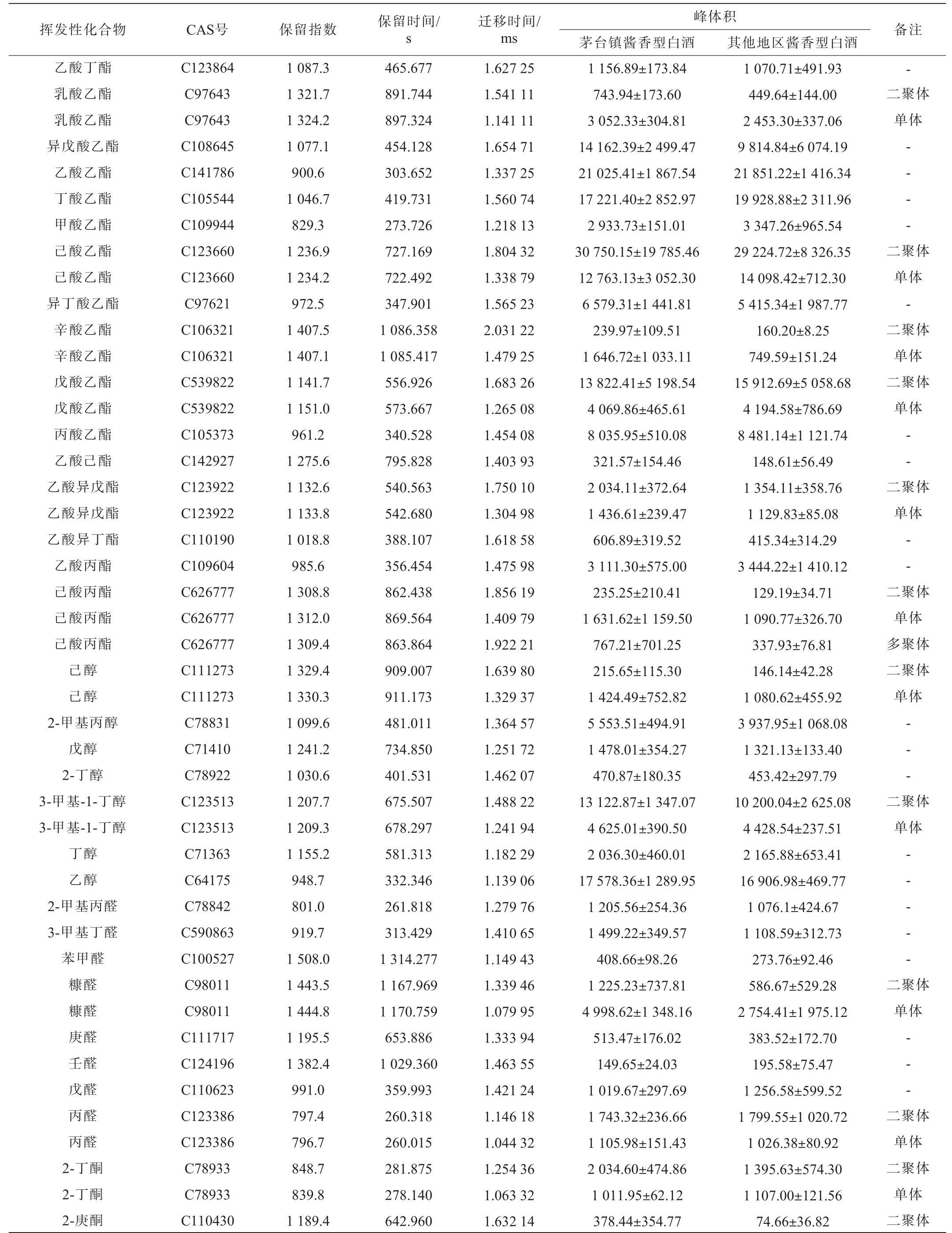 挥发性化合物 CAS号 保留指数 保留时间/s乙酸丁酯乳酸乙酯乳酸乙酯异戊酸乙酯乙酸乙酯丁酸乙酯甲酸乙酯己酸乙酯己酸乙酯异丁酸乙酯辛酸乙酯辛酸乙酯戊酸乙酯戊酸乙酯丙酸乙酯乙酸己酯乙酸异戊酯乙酸异戊酯乙酸异丁酯乙酸丙酯己酸丙酯己酸丙酯己酸丙酯己醇己醇2-甲基丙醇戊醇2-丁醇3-甲基-1-丁醇3-甲基-1-丁醇丁醇乙醇2-甲基丙醛3-甲基丁醛苯甲醛糠醛糠醛庚醛壬醛戊醛丙醛丙醛2-丁酮2-丁酮2-庚酮C123864 C97643 C97643 C108645 C141786 C105544 C109944 C123660 C123660 C97621 C106321 C106321 C539822 C539822 C105373 C142927 C123922 C123922 C110190 C109604 C626777 C626777 C626777 C111273 C111273 C78831 C71410 C78922 C123513 C123513 C71363 C64175 C78842 C590863 C100527 C98011 C98011 C111717 C124196 C110623 C123386 C123386 C78933 C78933 C110430 1 087.3 1 321.7 1 324.2 1 077.1 900.6 1 046.7 829.3 1 236.9 1 234.2 972.5 1 407.5 1 407.1 1 141.7 1 151.0 961.2 1 275.6 1 132.6 1 133.8 1 018.8 985.6 1 308.8 1 312.0 1 309.4 1 329.4 1 330.3 1 099.6 1 241.2 1 030.6 1 207.7 1 209.3 1 155.2 948.7 801.0 919.7 1 508.0 1 443.5 1 444.8 1 195.5 1 382.4 991.0 797.4 796.7 848.7 839.8 1 189.4 465.677 891.744 897.324 454.128 303.652 419.731 273.726 727.169 722.492 347.901 1 086.358 1 085.417 556.926 573.667 340.528 795.828 540.563 542.680 388.107 356.454 862.438 869.564 863.864 909.007 911.173 481.011 734.850 401.531 675.507 678.297 581.313 332.346 261.818 313.429 1 314.277 1 167.969 1 170.759 653.886 1 029.360 359.993 260.318 260.015 281.875 278.140 642.960迁移时间/ms 备注峰体积茅台镇酱香型白酒 其他地区酱香型白酒1.627 25 1.541 11 1.141 11 1.654 71 1.337 25 1.560 74 1.218 13 1.804 32 1.338 79 1.565 23 2.031 22 1.479 25 1.683 26 1.265 08 1.454 08 1.403 93 1.750 10 1.304 98 1.618 58 1.475 98 1.856 19 1.409 79 1.922 21 1.639 80 1.329 37 1.364 57 1.251 72 1.462 07 1.488 22 1.241 94 1.182 29 1.139 06 1.279 76 1.410 65 1.149 43 1.339 46 1.079 95 1.333 94 1.463 55 1.421 24 1.146 18 1.044 32 1.254 36 1.063 32 1.632 14 1 156.89±173.84 743.94±173.60 3 052.33±304.81 14 162.39±2 499.47 21 025.41±1 867.54 17 221.40±2 852.97 2 933.73±151.01 30 750.15±19 785.46 12 763.13±3 052.30 6 579.31±1 441.81 239.97±109.51 1 646.72±1 033.11 13 822.41±5 198.54 4 069.86±465.61 8 035.95±510.08 321.57±154.46 2 034.11±372.64 1 436.61±239.47 606.89±319.52 3 111.30±575.00 235.25±210.41 1 631.62±1 159.50 767.21±701.25 215.65±115.30 1 424.49±752.82 5 553.51±494.91 1 478.01±354.27 470.87±180.35 13 122.87±1 347.07 4 625.01±390.50 2 036.30±460.01 17 578.36±1 289.95 1 205.56±254.36 1 499.22±349.57 408.66±98.26 1 225.23±737.81 4 998.62±1 348.16 513.47±176.02 149.65±24.03 1 019.67±297.69 1 743.32±236.66 1 105.98±151.43 2 034.60±474.86 1 011.95±62.12 378.44±354.77 1 070.71±491.93 449.64±144.00 2 453.30±337.06 9 814.84±6 074.19 21 851.22±1 416.34 19 928.88±2 311.96 3 347.26±965.54 29 224.72±8 326.35 14 098.42±712.30 5 415.34±1 987.77 160.20±8.25 749.59±151.24 15 912.69±5 058.68 4 194.58±786.69 8 481.14±1 121.74 148.61±56.49 1 354.11±358.76 1 129.83±85.08 415.34±314.29 3 444.22±1 410.12 129.19±34.71 1 090.77±326.70 337.93±76.81 146.14±42.28 1 080.62±455.92 3 937.95±1 068.08 1 321.13±133.40 453.42±297.79 10 200.04±2 625.08 4 428.54±237.51 2 165.88±653.41 16 906.98±469.77 1 076.1±424.67 1 108.59±312.73 273.76±92.46 586.67±529.28 2 754.41±1 975.12 383.52±172.70 195.58±75.47 1 256.58±599.52 1 799.55±1 020.72 1 026.38±80.92 1 395.63±574.30 1 107.00±121.56 74.66±36.82-二聚体单体-- - -二聚体单体-二聚体单体二聚体单体--二聚体单体--二聚体单体多聚体二聚体单体-- -二聚体单体-- - - -二聚体单体-- -二聚体单体二聚体单体二聚体