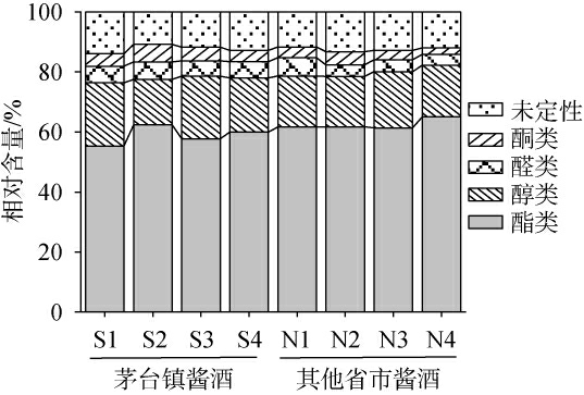 图1 茅台镇和其他产区酱香型白酒中不同类别挥发性成分的相对含量