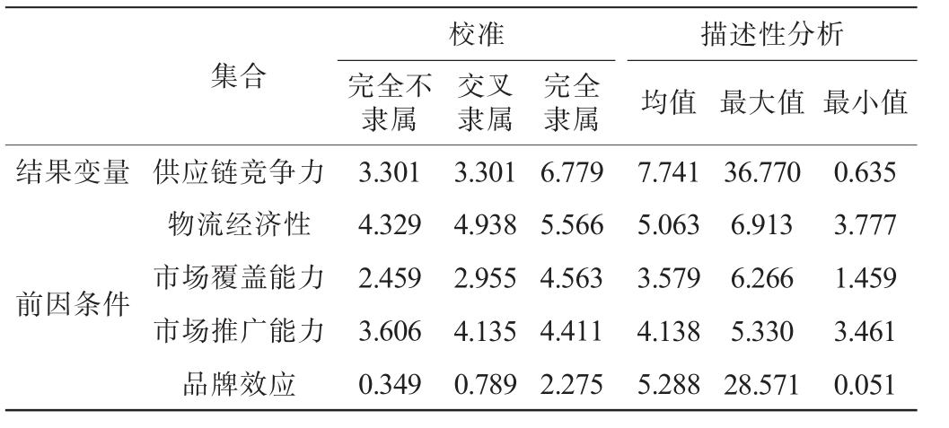 描述性分析均值 最大值 最小值结果变量集合校准完全不隶属交叉隶属前因条件供应链竞争力物流经济性市场覆盖能力市场推广能力品牌效应3.301 4.329 2.459 3.606 0.349 3.301 4.938 2.955 4.135 0.789完全隶属6.779 5.566 4.563 4.411 2.275 7.741 5.063 3.579 4.138 5.288 36.770 6.913 6.266 5.330 28.571 0.635 3.777 1.459 3.461 0.051