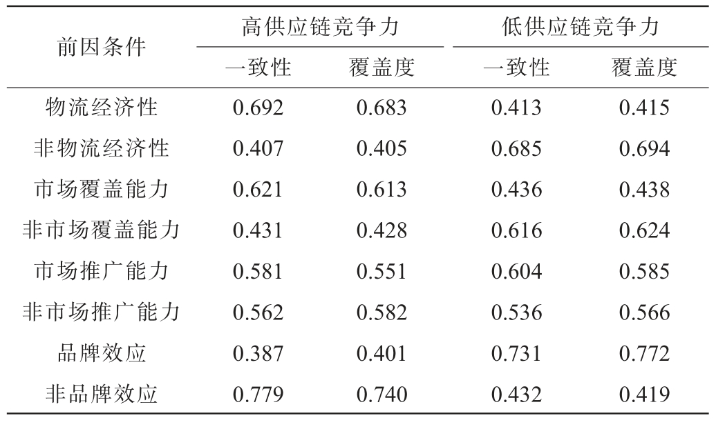 进行组态分析之前,需对单一条件进行必要性分析。由表3可知,所有前因条件对结果的必要性均未超过0.9[37]。结果表明,无论是高供应链竞争力还是低供应链竞争力,均不依赖于单一因素,因此需要对前因条件组态的影响进行深入研究。