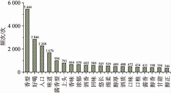 最终从网络平台共抓取了6 435条关于酱香型白酒的评论,通过停用词去除和低频词筛除后得到1 230个高频词,再经人工剔除处理后剩余349个高频词。 这些高频词频次范围为40~5 444次之间,其高频词词云图见图2,高频词统计结果见图3。由图2和图3可知,频次前十位的高频词依次是 “香型”、“好喝”、“入口”、“味道”、“酱香型”、“上头”、“香味”、“浓郁”、“酒香”、“回味”。