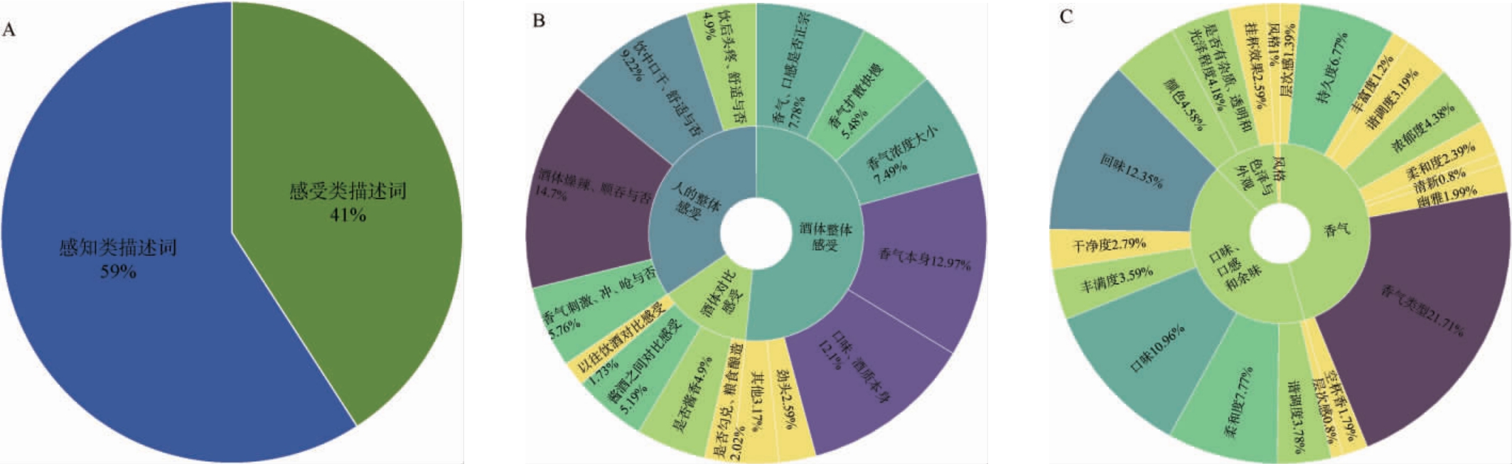A为感受类和感知类描述词占比,B为感受类各描述词占比,C为感知类各描述词占比。
