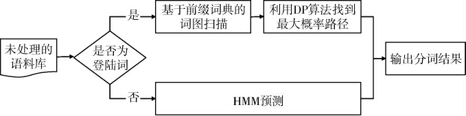 利用jieba(一个广泛使用的Python开源中文词语分割工具)对语料库文本进行预处理。这个过程包括4个主要步骤:预处理词语数据文件,根据前缀扫描词语图生成句子中所有可能的汉字成词情况的有向无环图(directed acyclic graph,DAG),利用动态编程(dynamic programming,DP)算法找到基于词频的最大切割组合,以及利用隐马尔可夫模型(hidden Markov model,HMM)预测评论中未登记的词语[31-32],具体过程见图1。