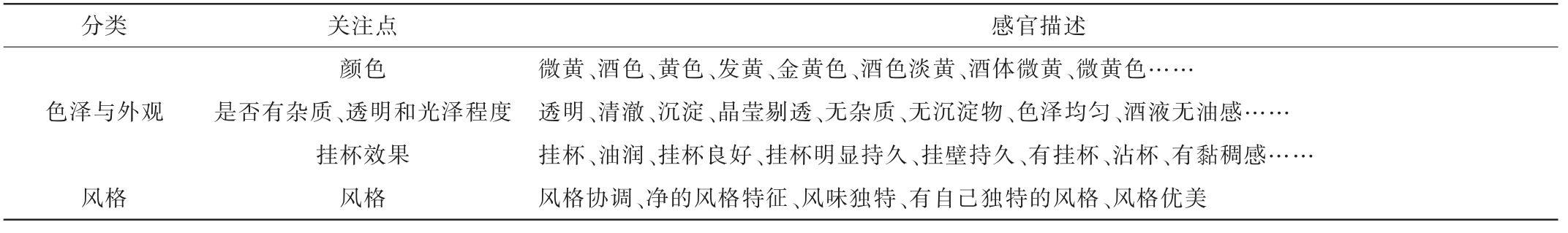 分类 关注点 感官描述色泽与外观风格颜色是否有杂质、透明和光泽程度挂杯效果风格微黄、酒色、黄色、发黄、金黄色、酒色淡黄、酒体微黄、微黄色……透明、清澈、沉淀、晶莹剔透、无杂质、无沉淀物、色泽均匀、酒液无油感……挂杯、油润、挂杯良好、挂杯明显持久、挂壁持久、有挂杯、沾杯、有黏稠感……风格协调、净的风格特征、风味独特、有自己独特的风格、风格优美