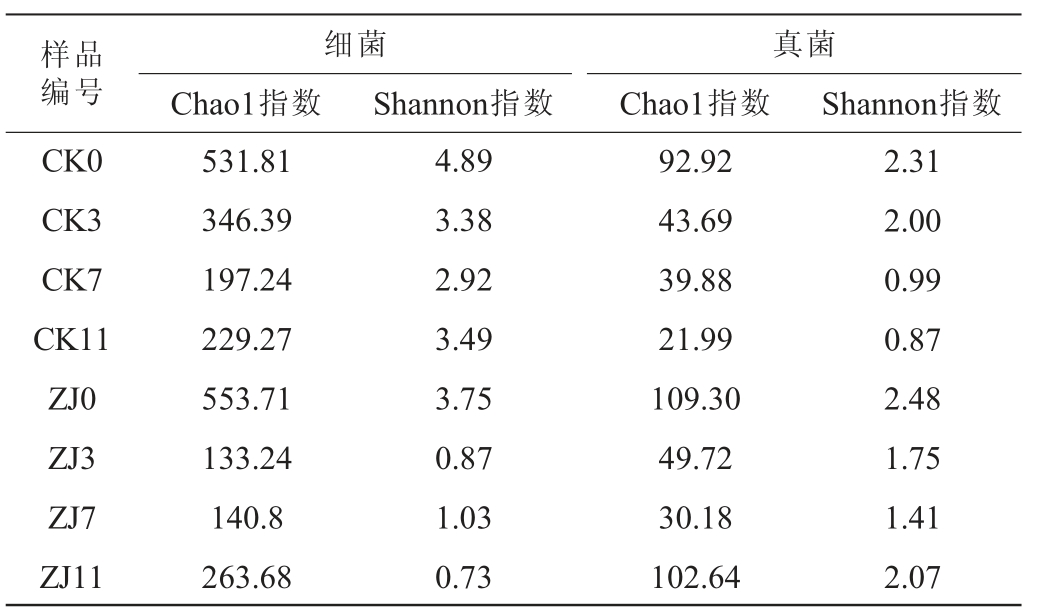 样品编号CK0 CK3 CK7 CK11 ZJ0 ZJ3 ZJ7 ZJ11细菌Chao1指数Shannon指数真菌Chao1指数 Shannon指数531.81 346.39 197.24 229.27 553.71 133.24 140.8 263.68 4.89 3.38 2.92 3.49 3.75 0.87 1.03 0.73 92.92 43.69 39.88 21.99 109.30 49.72 30.18 102.64 2.31 2.00 0.99 0.87 2.48 1.75 1.41 2.07