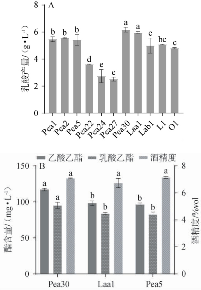 乳酸是清香型白酒发酵过程中合成的重要有机酸,也是合成乳酸乙酯的前体物质[25]。分析11株乳酸菌乳酸产量,并将初步筛选乳酸菌与酵母菌混合(1∶1)固态发酵,酒醅酒精度、乙酸乙酯、乳酸乙酯结果见图5。由图5A可知,通过分析检测11株乳酸菌发酵生成的乳酸含量,乳酸片球菌Pea30和嗜酸乳杆菌Laa1乳酸产量较高,分别为6.3 g/L、5.9 g/L,其次是乳酸片球菌Pea1、Pea2和Pea5,分别为5.6 g/L、5.55 g/L、5.7 g/L。结合乳酸菌菌株酒精耐受性分析,菌株Pea30、Pea5和Laa1有较强的酒精耐受性,并且产乳酸能力强。因此,初步筛选得到菌株Pea30、Pea5和Laa1 3株优良乳酸菌。
