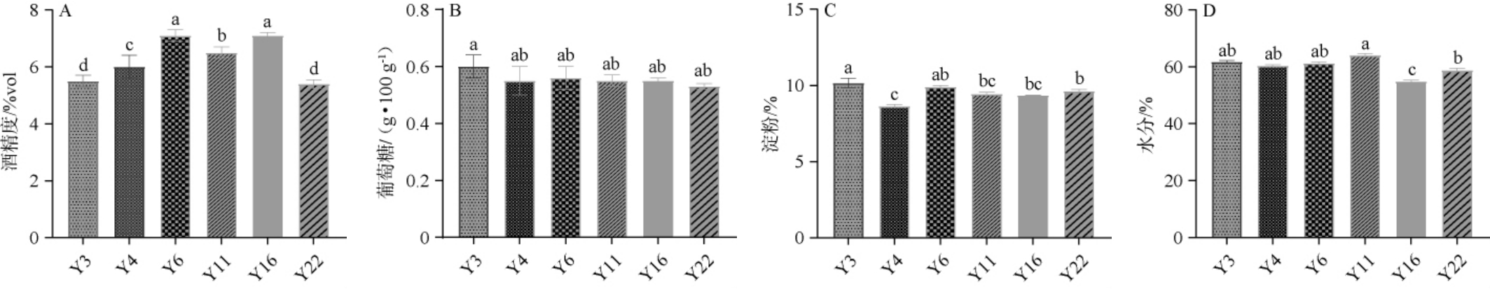 A:酒精度;B:还原糖;C:淀粉;D:水分。不同小写字母表示差异显著(P<0.05)。下同。