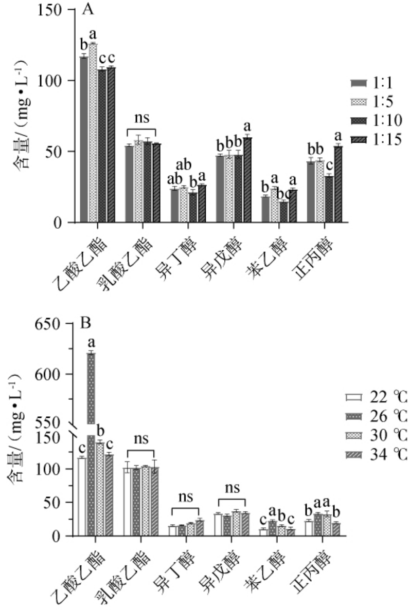 图7 菌株Y6与菌株Pea30不同接种比例(A)及入池温度(B)对清香型白酒主要酯类和醇类含量的影响