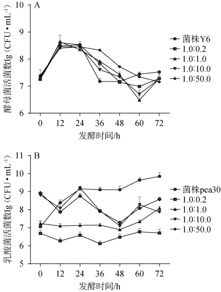 通过固定酿酒酵母的接种量,改变乳酸菌的接种量,采用RT-PCR法考察固态发酵过程中酿酒酵母Y6与乳酸片球菌Pea30活菌数的变化,以探究功能菌株之间的相互作用,菌株Y6、菌株Pea30单菌以及菌株Y6与Pea30不同接种比例(1.0∶0.2、1.0∶1.0、1.0∶10.0、1.0∶50.0)混菌发酵对酵母菌、乳酸菌生长的影响,结果见图6。
