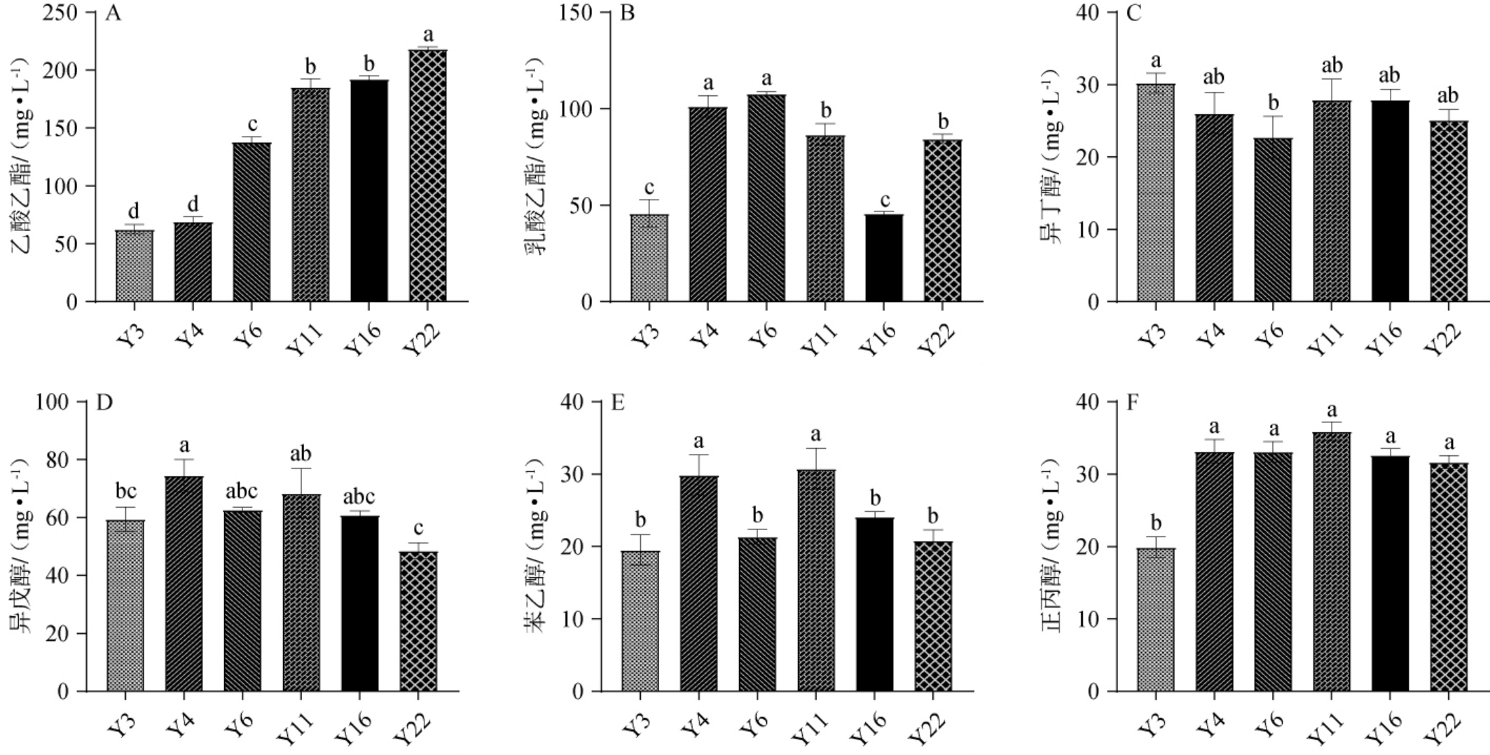 A:乙酸乙酯;B:乳酸乙酯;C:异丁醇;D:异戊醇;E:苯乙醇;F:正丙醇。