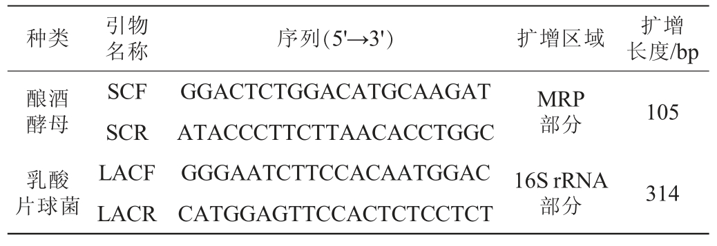 种类 引物名称 序列(5'→3') 扩增区域 扩增长度/bp酿酒酵母105乳酸片球菌SCF SCR LACF LACR GGACTCTGGACATGCAAGAT ATACCCTTCTTAACACCTGGC GGGAATCTTCCACAATGGAC CATGGAGTTCCACTCTCCTCT MRP部分16S rRNA部分314