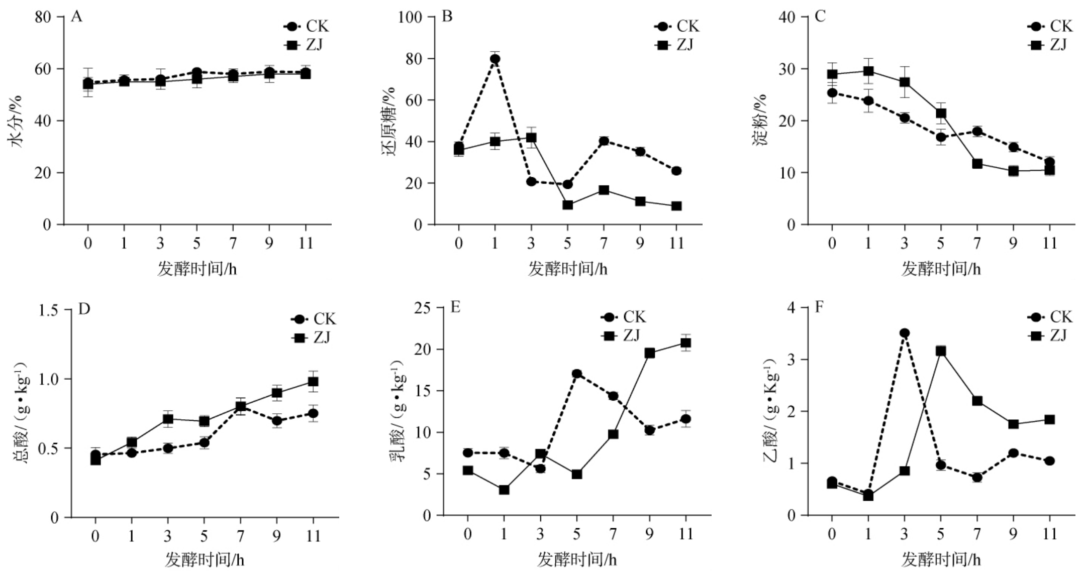 A:水分;B:还原糖;C:淀粉;D:总酸;E:乳酸;F:乙酸。
