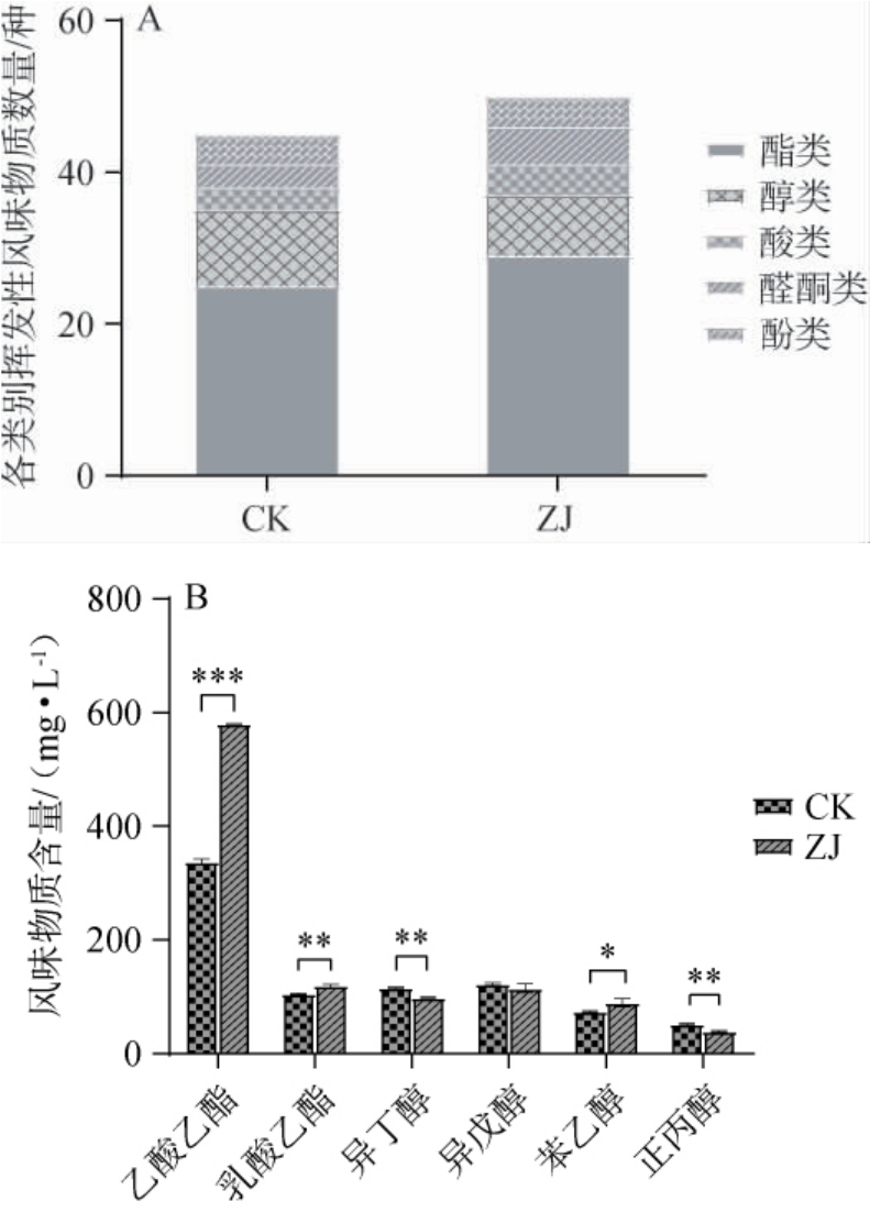 以不添加功能菌株发酵的清香型白酒酒醅为对照(CK),分析酿酒酵母Y6和乳酸菌Pea30的加入对清香型白酒酒醅发酵过程中理化指标的影响,结果见图8。含水量的变化会影响微生物群落的结构和演替,从而影响白酒产品的产量和质量[27]。由图8A可知,两个发酵组含水量动态变化一致,呈上升的趋势,发酵前的酒醅水分都为55%,发酵后期都维持在58%左右。由图8B可知,CK组的还原糖含量在第1天迅速升高,ZJ组在发酵前期还原糖含量有少量增多,在发酵过程中,微生物分解原料中大分子产生还原糖,使还原糖含量增多。 之后还原糖又被微生物本身用于生长、繁殖和新陈代谢[28],还原糖含量不断下降。随着ZJ组发酵环境中微生物组成逐渐丰富,微生物还原糖消耗量逐渐增多,即菌剂的加入提高了还原糖的利用率。由图8C可知,发酵过程中淀粉水解为还原糖,进一步转化为乙醇和各种风味物质,淀粉含量均呈现整体下降的趋势,发酵至末期淀粉含量为10.44%~12.06%。由图8D可知,随着发酵的进行总酸含量逐渐升高,其中ZJ组发酵后期总酸含量达到0.98 g/kg。由图8E可知,乳酸含量在前期基本保持稳定,后期不断积累,含量迅速增多。 在发酵结束时ZJ组的乳酸含量最高(20.77 mg/L)。由图8F可知,乙酸含量先增加后下降,可能发酵后期乙酸参与乙酸酯的合成。ZJ组因为接入功能菌株,其发酵结束时酒醅中的乳酸、乙酸和总酸含量分别为20.77 mg/L、1.84 mg/L和0.98 mg/L,均高于对照。 综上,在清香型白酒酒醅发酵过程中添加了功能菌株后理化指标的含量和变化趋势都发生了改变,功能菌株的加入提高了还原糖利用率,促进了淀粉的高效转化,使发酵更彻底。同时显著增加了乳酸、乙酸及总酸含量。这些变化有助于酯类风味物质的生成,提升酒体香气和口感协调性,从而改善清香型白酒的整体品质。