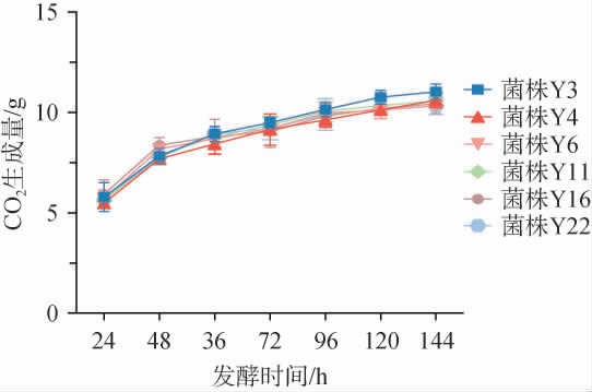 酿酒酵母发酵过程主要是代谢葡萄糖生成酒精、水和二氧化碳。CO2生成量多,说明发酵速度快,酵母发酵能力强。因此,可以通过发酵过程中CO2生成量的变化来评价酵母的发酵能力。由图1可知,6株酿酒酵母CO2生成量的变化基本一致,总发酵天数都为7 d,且前24 h CO2生成量最多,发酵速率最快。