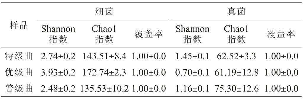 表2 不同等级中高温大曲微生物群落Alpha多样性分析结果