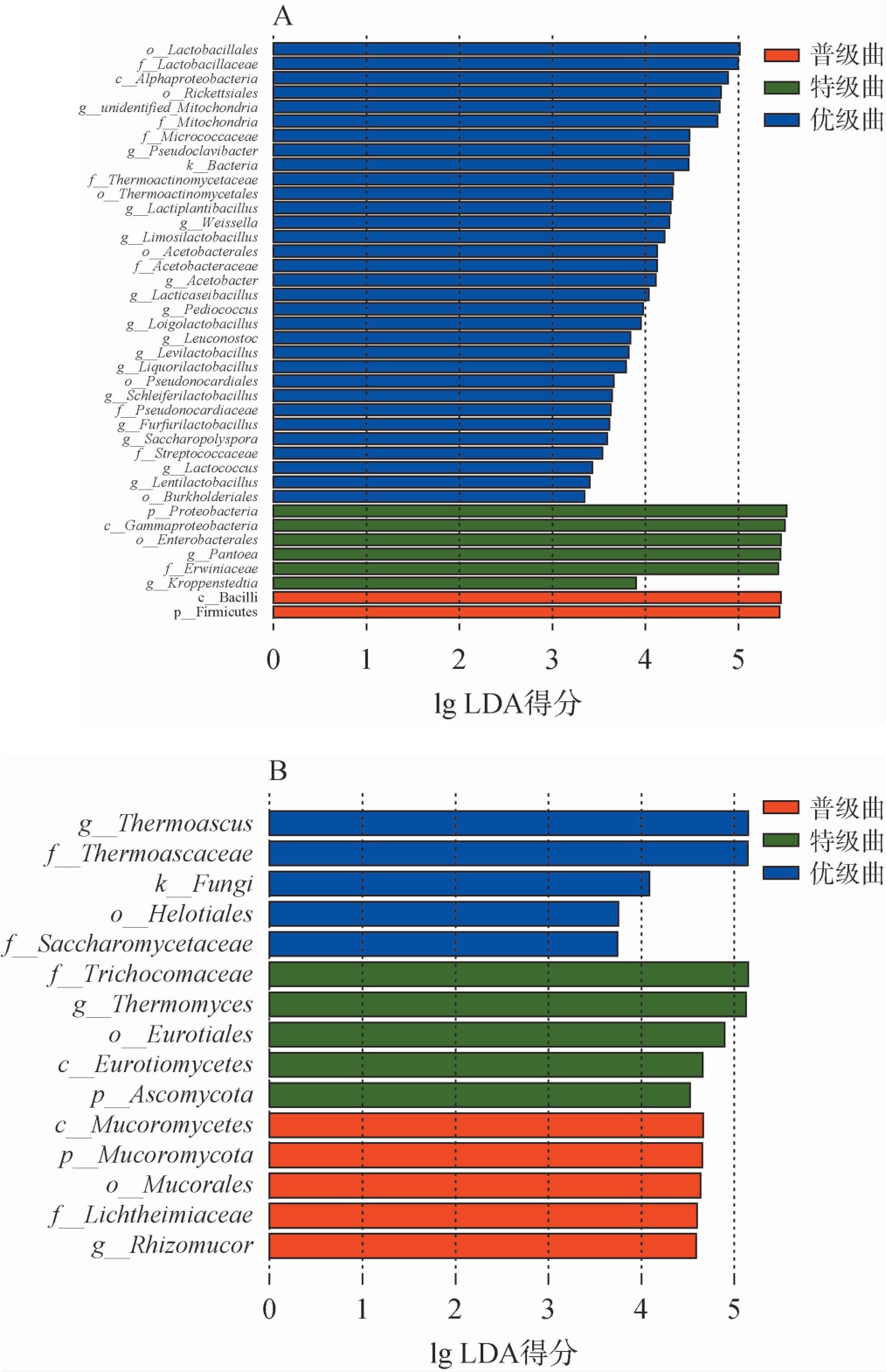 图2 不同等级中高温大曲细菌(A)及真菌(B)菌群线性判别分析效应大小分析结果