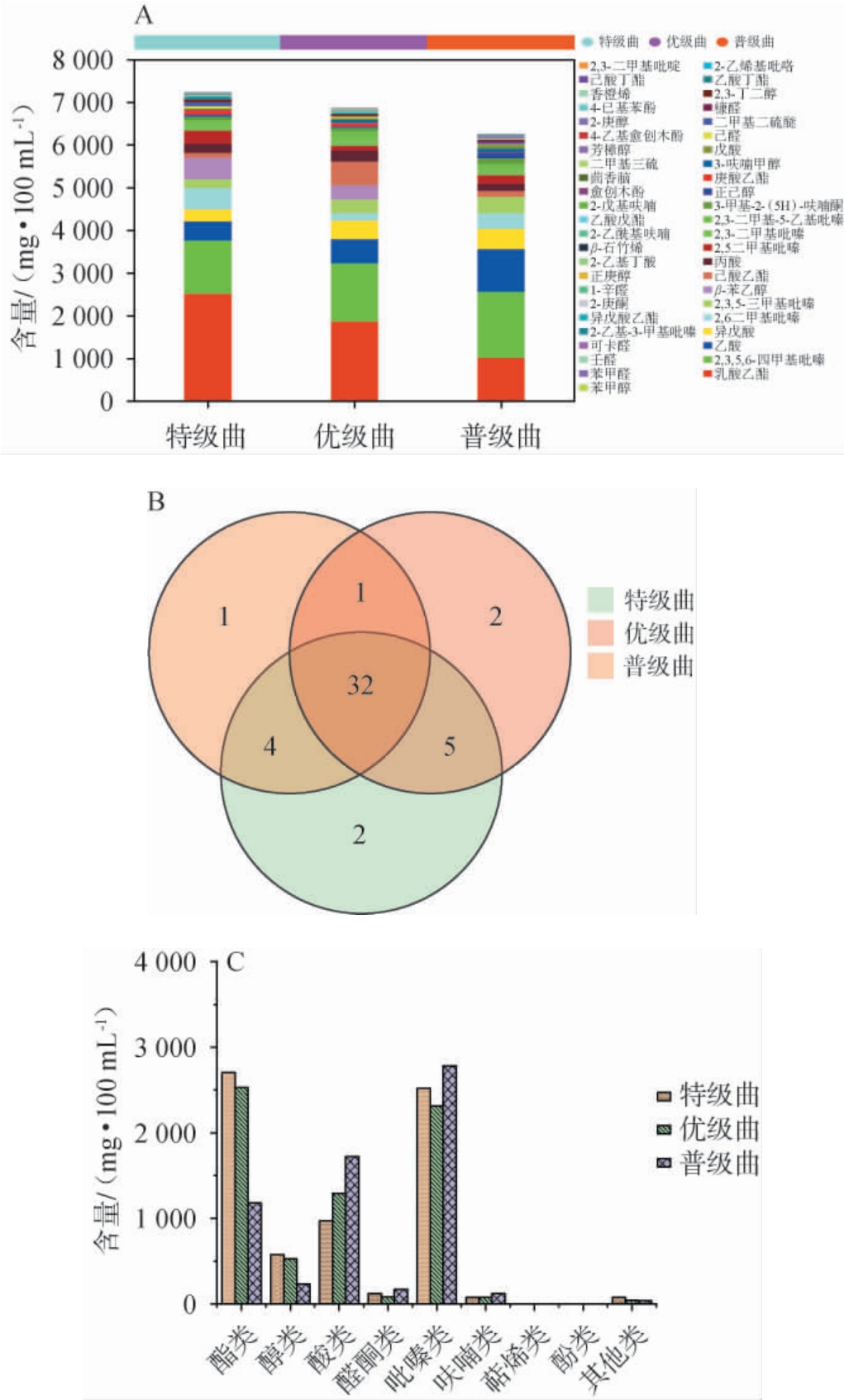 由图3A可知,不同等级中高温大曲中共检出47种挥发性风味化合物,包括酯类7种,醇类8种,酸类5种,醛酮类7种,吡嗪类7种,呋喃类3种,萜烯类2种,酚类3种,其他类5种。 特级曲中共检出47种,挥发性风味化合物总含量为7 054.20 mg/100 mL,包括酯类7种,醇类8种,酸类5种,醛酮类7种,吡嗪类7种,呋喃类3种,萜烯类2种,酚类3种,其他类5种;优级曲中共检出40种,挥发性风味化合物总含量为6 871.30 mg/100 mL,包括酯类7种,醇类7种,酸类4种,醛酮类7种,吡嗪类7种,呋喃类3种,无萜烯类,酚类1种,其他类4种;普级曲中共检出37种,挥发性风味化合物总含量为6 253.51 mg/100 mL,包括酯类6种,醇类5种,酸类5种,醛酮类7种,吡嗪类7种,呋喃类1种,萜烯类1种,酚类3种,其他类2种。 按挥发性风味物质的总含量递减排序为特级曲、优级曲和普级曲。其中,特级曲中β-苯乙醇和乳酸乙酯含量较高,而优级曲则己酸乙酯含量较高,普级曲乙酸的含量较高。 由图3B可知,特级曲、优级曲、普级曲中共有的挥发性风味物质包括32种,特级曲、优级曲中共有的挥发性风味物质包括5种,特级曲、普级曲共有的挥发性风味物质包括4种,优级曲、普级曲共有的挥发性风味物质仅有1种;特级曲独有的挥发性风味物质为β-石竹烯、2,3-二甲基吡啶,优级曲独有的挥发性风味物质为己酸丁酯、茴香脑,普级曲独有的挥发性风味物质为香橙烯。 由图3C可知,特级曲、优级曲中酯类物质较多(分别为2 705.30 mg/100 mL、2 533.20 mg/100 mL),特级曲、优级曲、普级曲中吡嗪类物质较多(分别为2 519.71 mg/100 mL、2 314.14 mg/100 mL、2 784.40 mg/100 mL)。