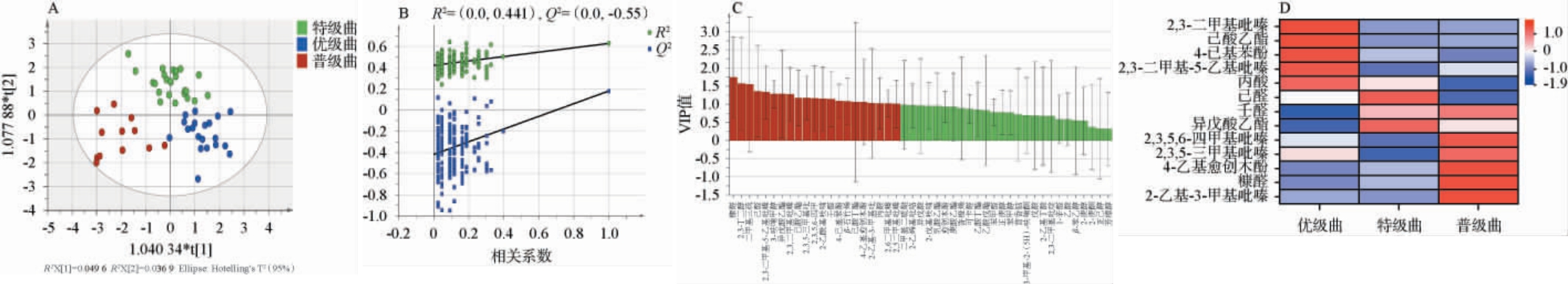 Fig.5 Orthogonal partial least squares-discriminant analysis score plot (A), 200 permutation test results (B), variable importance in the projection values (C) and cluster analysis heatmap (D) of volatile flavor substances contents in medium-high temperature Daqu with different grades