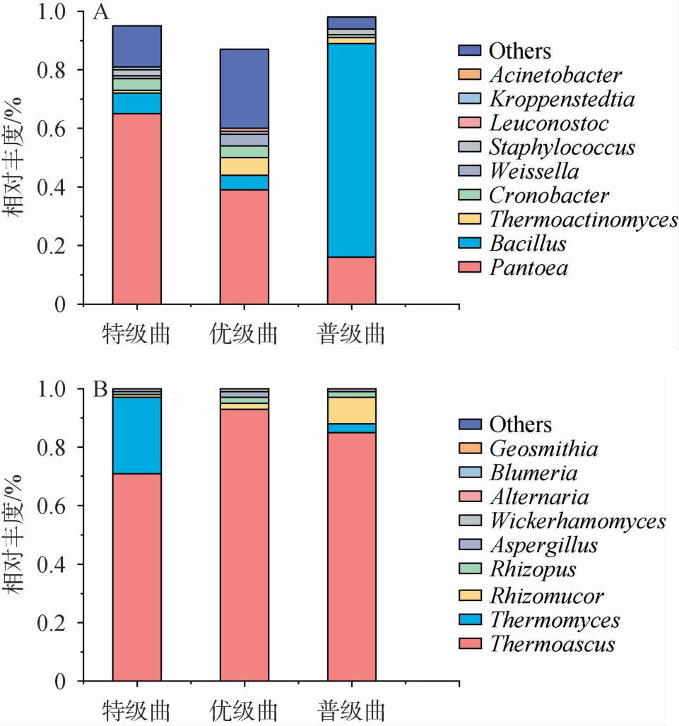 图1 基于属水平不同等级中高温大曲细菌(A)及真菌(B)群落结构