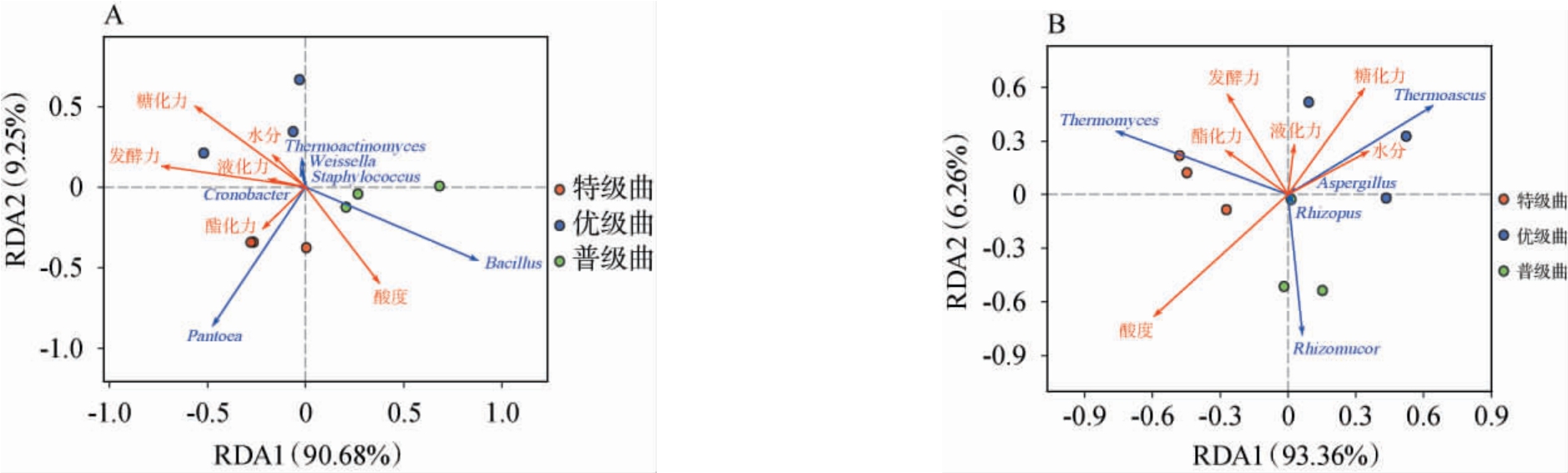 Fig.6 Redundancy analysis results of dominant bacterial genera (A), fungal genera (B) and physicochemical indicators of medium-high temperature Daqu with different grades