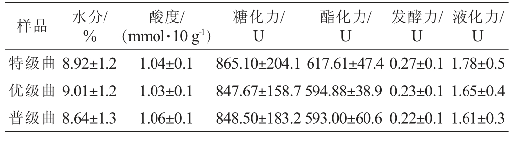 Table 1 Determination results of physicochemical indicators of medium-high temperature Daqu with different grades