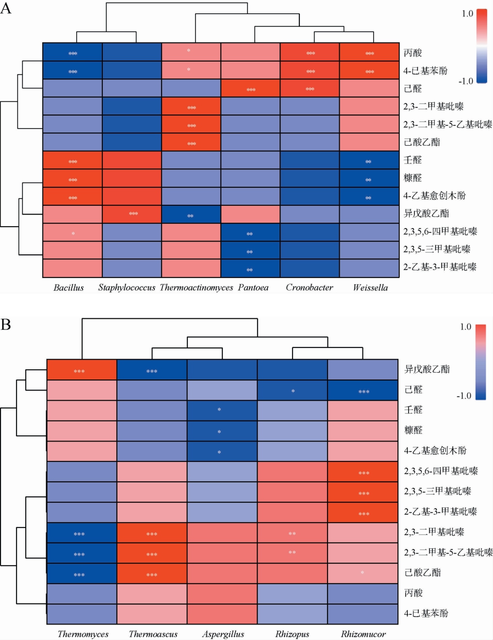图7 优势细菌属(A)、优势真菌属(B)与关键差异挥发性风味物质的相关性热图