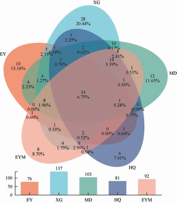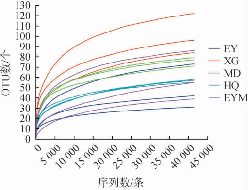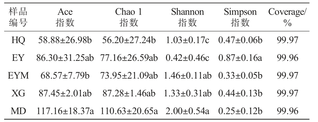 样品编号Ace指数Chao 1指数Shannon指数Simpson指数Coverage/%HQ EY EYM XG MD 99.97 99.96 99.97 99.97 99.96 58.88±26.98b 86.30±31.25ab 68.57±7.79b 87.45±2.01ab 117.16±18.37a 56.20±27.24b 77.16±26.59ab 73.95±21.09ab 87.28±1.46ab 110.63±20.65a 1.03±0.17c 0.42±0.46c 1.46±0.11ab 1.33±0.31ab 2.00±0.54a 0.47±0.06b 0.87±0.16a 0.33±0.05b 0.44±0.13b 0.25±0.12b