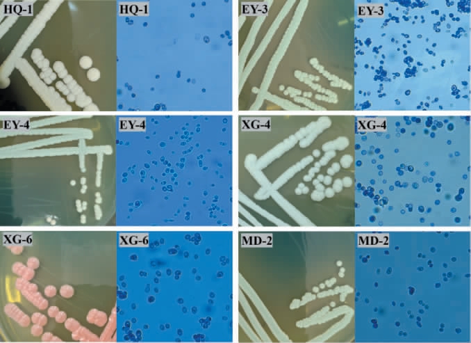 由图5可知,乳扇样品中分离得到的酵母菌菌落呈圆形,颜色大多为乳白色(如菌株EY-4和XG-4)或乳黄色(如菌株HQ-1、EY-3和MD-2),少数为粉红色(如菌株XG-6),菌落边缘整齐,表面光滑、湿润。细胞形态为圆形或椭圆形,均观察到出芽繁殖。