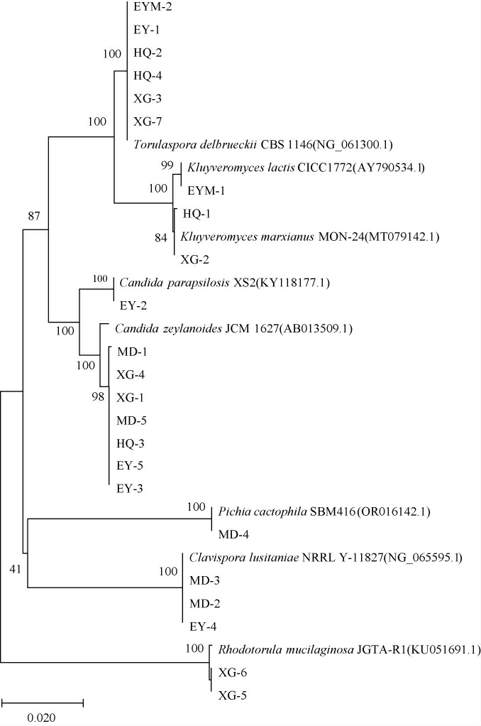 由图6可知,菌株EYM-2、EY-1、HQ-2、HQ-4、XG-3和XG-7与德尔布有孢圆酵母(Torulaspora delbrueckii)CBS 1146(NG_061300.1)聚于一支,亲缘关系最近;菌株EYM-1与乳酸克鲁维酵母(Kluyveromyceslactis)CICC1772(AY790534.1)聚于一支,亲缘关系最近;菌株HQ-1和XG-2与马克思克鲁维酵母(Kluyveromyces marxianus)MON-24(MT079142.1)聚于一支,亲缘关系最近;菌株EY-2与近平滑假丝酵母(Candida parapsilosis)XS2(KY118177.1)聚于一支,亲缘关系最近;菌株HQ-3、EY-3、EY-5、XG-1、XG-4、MD-1和MD-5与诞沫假丝酵母(Candidazeylanoides)JCM1627(AB013509.1)聚于一支,亲缘关系最近;菌株MD-4与喜仙人掌毕赤酵母(Pichia cactophila)SBM416(OR016142.1)聚于一支,亲缘关系最近;菌株EY-4、MD-2和MD-3与葡萄牙棒孢酵母(Clavispora lusitaniae)NRRL Y-11827(NG_065595.1)聚于一支,亲缘关系最近;菌株XG-5和XG-6与胶红酵母(Rhodotorula mucilaginosa)JGTA-R1(KU051691.1)聚于一支,亲缘关系最近。 综上,结合形态学特征及分子生物学鉴定结果,23株酵母菌归属于6个属8个种,分别是有孢圆酵母属(Torulaspora)的德尔布有孢圆酵母(Torulaspora delbrueckii)(HQ-2、HQ-4、EY-1、EYM-2、XG-3和XG-7,共6株)、克鲁维酵母属(Kluyveromyces)的乳酸克鲁维酵母(Kluyveromyces lactis)(EYM-1,共1株)和马克思克鲁维酵母(Kluyveromyces marxianus)(HQ-1和XG-2,共2株)、假丝酵母属(Candida)的近平滑假丝酵母(Candida parapsilosis)(EY-2,共1株)和诞沫假丝酵母(Candida zeylanoides)HQ-3、EY-3、EY-5、XG-1、XG-4、MD-1和MD-5,共7株)、毕赤酵母属(Pichia)的喜仙人掌毕赤酵母(Pichia cactophila)(MD-4,共1株)、棒孢酵母属(Clavispora)的葡萄牙棒孢酵母(Clavispora lusitaniae)(EY-4、MD-2和MD-3,共3株)和红酵母属(Rhodotorula)的胶红酵母(Rhodotorula mucilaginosa)(XG-5和XG-6,共2株)。 结果表明,乳扇样品中的酵母菌资源非常丰富,且不同来源乳扇样品中分离得到的酵母菌种存在差异,而原料乳是乳制品中微生物的主要来源[27],此外加工环境[28]也对乳扇中的微生物菌群有影响,乳扇中酵母菌种的差异可能与原料乳及采样地的环境有关[29]。