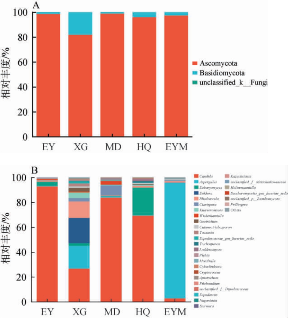 为探究不同乳扇样品真菌群落在不同分类学水平上的组成情况,基于门和属水平对5个乳扇样品中的真菌群落结构进行分析,结果见图3。由图3A可知,5个乳扇样品中共注释到2个优势真菌门(平均相对丰度>1%),分别为子囊菌门(Ascomycota)(94.50%)和担子菌门(Basidiomycota)(5.49%)。 5个乳扇样品中子囊菌门的相对丰度均>80%,其中,子囊菌门在样品MD和EY中的相对丰度较高,分别达到98.74%和98.49%。担子菌门在样品XG中的相对丰度最高,为18.12%。