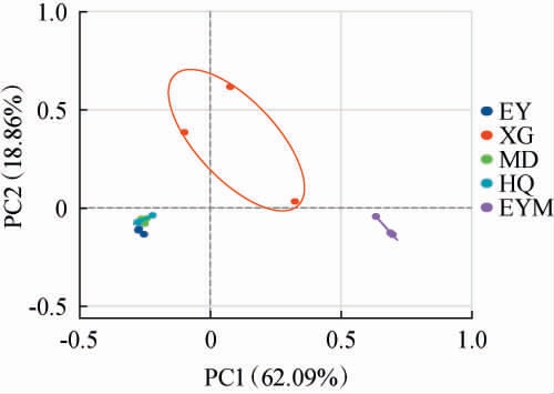 为了分析不同乳扇样品真菌群落组成差异,在OTU水平上进行样品真菌群落主坐标分析(principal co-ordinates analysis,PCoA),结果见图4。 由图4可知,PCoA1和PCoA2的方差贡献率分别为62.09%和18.86%,累计方差贡献率为80.95%,说明前两个成分能真实、可靠地反映样品的真菌菌群信息。其中,样品EY、MD、HQ分布在同一象限且距离较近,且样品MD与HQ交错分布,说明这3个样品的真菌群落组成差异性较小,结合乳扇样品在属水平的真菌群落结构(图3B),3个样品较高的相似性可能体现在其优势真菌属种类和相对丰度上。反之,样品XG分布在第一、二象限,样品EYM分布在第四象限,说明两者间且与其他样品间真菌群落组成差异较大。 样品EY和EYM来自同一采样地,两样品的真菌群落组成差异却较大,这可能与样品EYM中的玫瑰花有关系。 植物体内普遍存在内生菌[24],玫瑰花中也可能存在,这类外源菌群可能会影响乳扇的真菌群落;玫瑰花中含有的成分如多糖、蛋白质、氨基酸等,可能会为乳扇中的一些真菌提供原料乳之外的新营养源[25];玫瑰花中的黄酮、多酚等成分可能对某些菌群具有抑制作用,这些因素最终导致添加与不添加玫瑰花的乳扇中真菌群落组成的差异[26]。