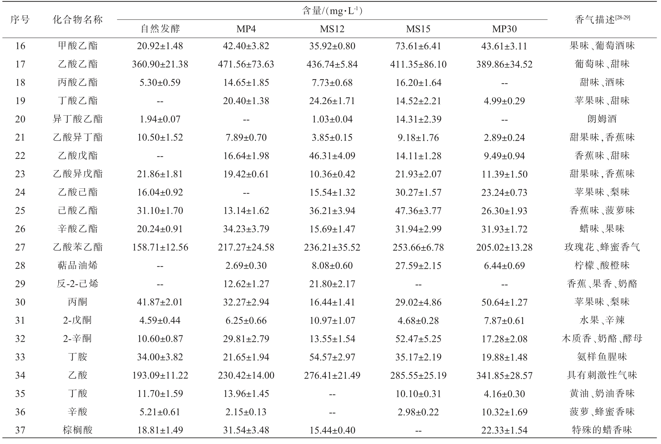 序号 化合物名称 香气描述[28-29]含量/(mg·L-1)自然发酵 MP4 MS12 MS15 MP30 16 17 18 19 20 21 22 23 24 25 26 27 28 29 30 31 32 33 34 35 36 37甲酸乙酯乙酸乙酯丙酸乙酯丁酸乙酯异丁酸乙酯乙酸异丁酯乙酸戊酯乙酸异戊酯乙酸己酯己酸乙酯辛酸乙酯乙酸苯乙酯萜品油烯反-2-己烯丙酮2-戊酮2-辛酮丁胺乙酸丁酸辛酸棕榈酸20.92±1.48 360.90±21.38 5.30±0.59--1.94±0.07 10.50±1.52--21.86±1.81 16.04±0.92 31.10±1.70 20.24±0.91 158.71±12.56——41.87±2.01 4.59±0.44 10.60±0.87 34.00±3.82 193.09±11.22 11.70±1.59 5.21±0.61 18.81±1.49 42.40±3.82 471.56±73.63 14.65±1.85 20.40±1.38--7.89±0.70 16.64±1.98 19.42±0.61--13.14±1.62 34.23±3.79 217.27±24.58 2.69±0.30 12.62±1.27 32.27±2.94 6.25±0.66 29.81±2.79 21.65±1.94 230.42±14.00 13.96±1.45 2.15±0.13 31.54±3.48 35.92±0.80 436.74±5.84 7.73±0.68 24.26±1.71 1.03±0.04 3.85±0.15 46.31±4.09 10.36±0.42 15.54±1.32 36.21±3.94 15.69±1.47 236.21±35.52 8.08±0.60 21.80±2.17 16.44±1.41 10.97±1.07 13.55±1.54 54.57±2.97 276.41±21.49——15.44±0.40 73.61±6.41 411.35±86.10 16.20±1.64 14.52±2.21 14.31±2.39 9.18±1.76 14.11±1.28 21.93±2.07 30.27±1.57 47.36±3.77 31.94±2.99 253.66±6.78 27.59±2.15--29.02±4.86 4.68±0.28 52.47±5.25 35.17±2.19 285.55±25.19 10.10±0.31 2.98±0.22--43.61±3.11 389.86±34.52--4.99±0.29--2.89±0.24 9.49±0.94 11.39±1.50 23.24±0.73 26.30±1.93 31.93±1.72 205.02±13.28 6.44±0.69--50.64±1.27 7.87±0.61 17.28±2.08 19.88±1.48 341.85±28.57 4.16±0.30 10.32±1.69 22.33±1.54果味、葡萄酒味葡萄味、甜味甜味、酒味苹果味、甜味朗姆酒甜果味,香蕉味香蕉味、甜味甜果味,香蕉味苹果味、梨味香蕉味、菠萝味蜡味、果味玫瑰花、蜂蜜香气柠檬、酸橙味香蕉、果香、奶酪苹果味、梨味水果、辛辣木质香、奶酪、酵母氨样鱼腥味具有刺激性气味黄油、奶油香味菠萝、蜂蜜香味特殊的蜡香味