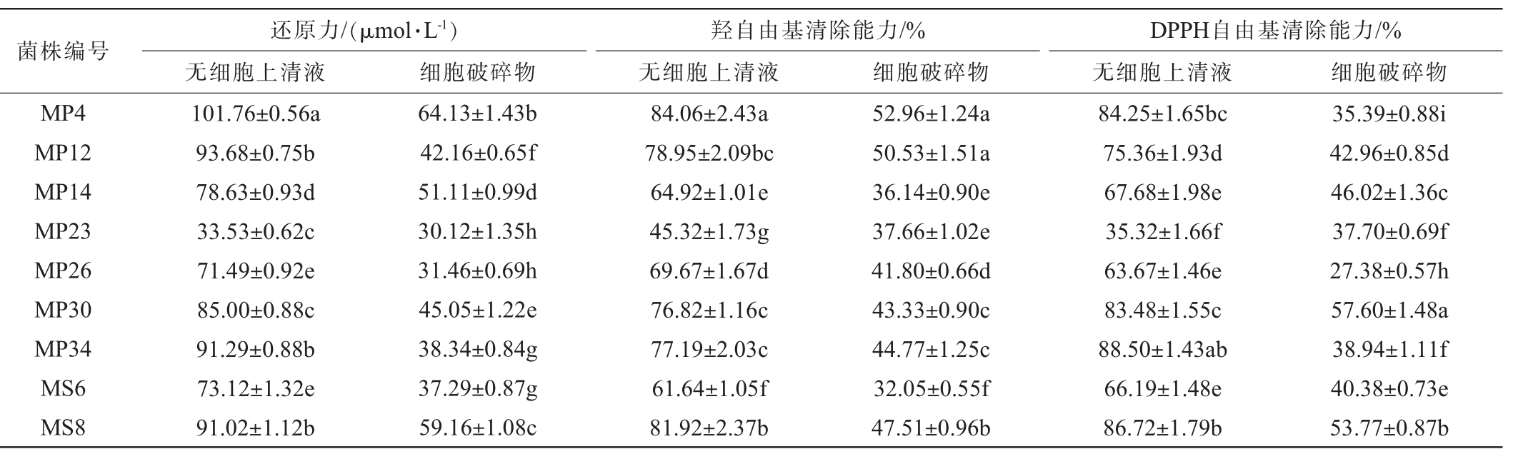 菌株编号 还原力/(μmol·L-1)无细胞上清液细胞破碎物 细胞破碎物羟自由基清除能力/%无细胞上清液DPPH自由基清除能力/%无细胞上清液 细胞破碎物MP4 MP12 MP14 MP23 MP26 MP30 MP34 MS6 MS8 101.76±0.56a 93.68±0.75b 78.63±0.93d 33.53±0.62c 71.49±0.92e 85.00±0.88c 91.29±0.88b 73.12±1.32e 91.02±1.12b 64.13±1.43b 42.16±0.65f 51.11±0.99d 30.12±1.35h 31.46±0.69h 45.05±1.22e 38.34±0.84g 37.29±0.87g 59.16±1.08c 84.06±2.43a 78.95±2.09bc 64.92±1.01e 45.32±1.73g 69.67±1.67d 76.82±1.16c 77.19±2.03c 61.64±1.05f 81.92±2.37b 52.96±1.24a 50.53±1.51a 36.14±0.90e 37.66±1.02e 41.80±0.66d 43.33±0.90c 44.77±1.25c 32.05±0.55f 47.51±0.96b 84.25±1.65bc 75.36±1.93d 67.68±1.98e 35.32±1.66f 63.67±1.46e 83.48±1.55c 88.50±1.43ab 66.19±1.48e 86.72±1.79b 35.39±0.88i 42.96±0.85d 46.02±1.36c 37.70±0.69f 27.38±0.57h 57.60±1.48a 38.94±1.11f 40.38±0.73e 53.77±0.87b