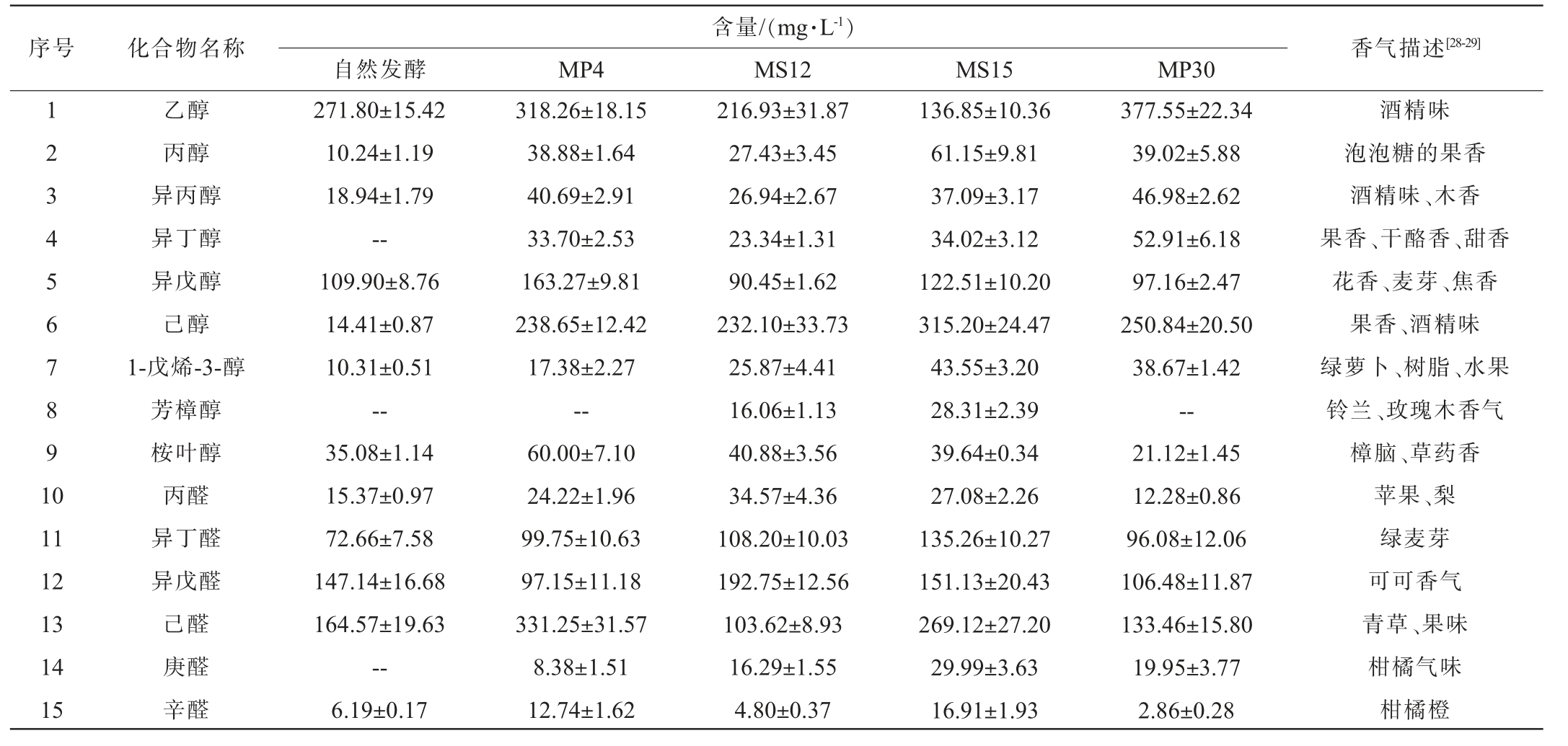 序号 化合物名称 香气描述[28-29]含量/(mg·L-1)自然发酵 MP4 MS12 MS15 MP30 1 2 3 4 5 6 7 8 9 1 0 11 12 13 14 15乙醇丙醇异丙醇异丁醇异戊醇己醇1-戊烯-3-醇芳樟醇桉叶醇丙醛异丁醛异戊醛己醛庚醛辛醛271.80±15.42 10.24±1.19 18.94±1.79--109.90±8.76 14.41±0.87 10.31±0.51--35.08±1.14 15.37±0.97 72.66±7.58 147.14±16.68 164.57±19.63--6.19±0.17 318.26±18.15 38.88±1.64 40.69±2.91 33.70±2.53 163.27±9.81 238.65±12.42 17.38±2.27--60.00±7.10 24.22±1.96 99.75±10.63 97.15±11.18 331.25±31.57 8.38±1.51 12.74±1.62 216.93±31.87 27.43±3.45 26.94±2.67 23.34±1.31 90.45±1.62 232.10±33.73 25.87±4.41 16.06±1.13 40.88±3.56 34.57±4.36 108.20±10.03 192.75±12.56 103.62±8.93 16.29±1.55 4.80±0.37 136.85±10.36 61.15±9.81 37.09±3.17 34.02±3.12 122.51±10.20 315.20±24.47 43.55±3.20 28.31±2.39 39.64±0.34 27.08±2.26 135.26±10.27 151.13±20.43 269.12±27.20 29.99±3.63 16.91±1.93 377.55±22.34 39.02±5.88 46.98±2.62 52.91±6.18 97.16±2.47 250.84±20.50 38.67±1.42--21.12±1.45 12.28±0.86 96.08±12.06 106.48±11.87 133.46±15.80 19.95±3.77 2.86±0.28酒精味泡泡糖的果香酒精味、木香果香、干酪香、甜香花香、麦芽、焦香果香、酒精味绿萝卜、树脂、水果铃兰、玫瑰木香气樟脑、草药香苹果、梨绿麦芽可可香气青草、果味柑橘气味柑橘橙