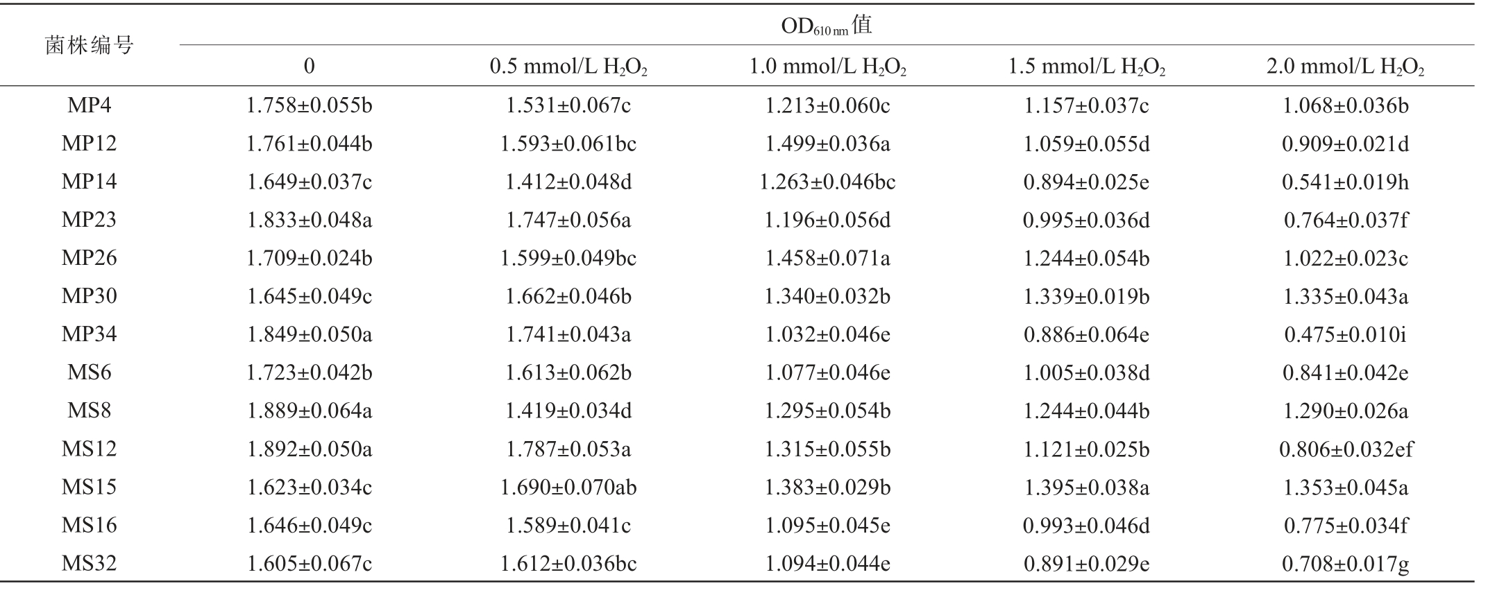 菌株编号MP4 MP12 MP14 MP23 MP26 MP30 MP34 MS6 MS8 MS12 MS15 MS16 MS32 OD610 nm值0 0.5 mmol/L H2O2 1.0 mmol/L H2O2 1.5 mmol/L H2O2 2.0 mmol/L H2O2 1.758±0.055b 1.761±0.044b 1.649±0.037c 1.833±0.048a 1.709±0.024b 1.645±0.049c 1.849±0.050a 1.723±0.042b 1.889±0.064a 1.892±0.050a 1.623±0.034c 1.646±0.049c 1.605±0.067c 1.531±0.067c 1.593±0.061bc 1.412±0.048d 1.747±0.056a 1.599±0.049bc 1.662±0.046b 1.741±0.043a 1.613±0.062b 1.419±0.034d 1.787±0.053a 1.690±0.070ab 1.589±0.041c 1.612±0.036bc 1.213±0.060c 1.499±0.036a 1.263±0.046bc 1.196±0.056d 1.458±0.071a 1.340±0.032b 1.032±0.046e 1.077±0.046e 1.295±0.054b 1.315±0.055b 1.383±0.029b 1.095±0.045e 1.094±0.044e 1.157±0.037c 1.059±0.055d 0.894±0.025e 0.995±0.036d 1.244±0.054b 1.339±0.019b 0.886±0.064e 1.005±0.038d 1.244±0.044b 1.121±0.025b 1.395±0.038a 0.993±0.046d 0.891±0.029e 1.068±0.036b 0.909±0.021d 0.541±0.019h 0.764±0.037f 1.022±0.023c 1.335±0.043a 0.475±0.010i 0.841±0.042e 1.290±0.026a 0.806±0.032ef 1.353±0.045a 0.775±0.034f 0.708±0.017g