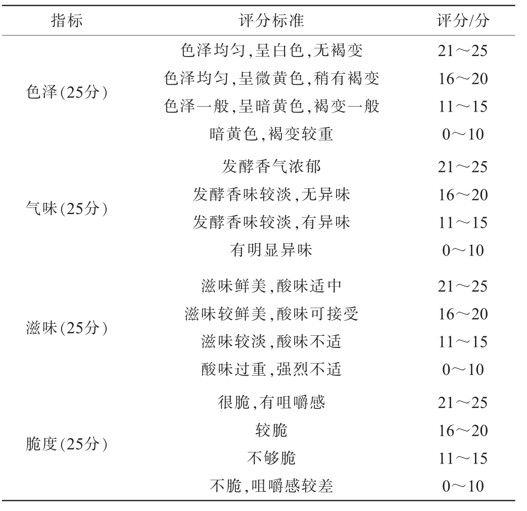 指标 评分标准 评分/分色泽(25分)气味(25分)滋味(25分)脆度(25分)色泽均匀,呈白色,无褐变色泽均匀,呈微黄色,稍有褐变色泽一般,呈暗黄色,褐变一般暗黄色,褐变较重发酵香气浓郁发酵香味较淡,无异味发酵香味较淡,有异味有明显异味滋味鲜美,酸味适中滋味较鲜美,酸味可接受滋味较淡,酸味不适酸味过重,强烈不适很脆,有咀嚼感较脆不够脆不脆,咀嚼感较差21~25 16~20 11~15 0~10 21~25 16~20 11~15 0~10 21~25 16~20 11~15 0~10 21~25 16~20 11~15 0~10