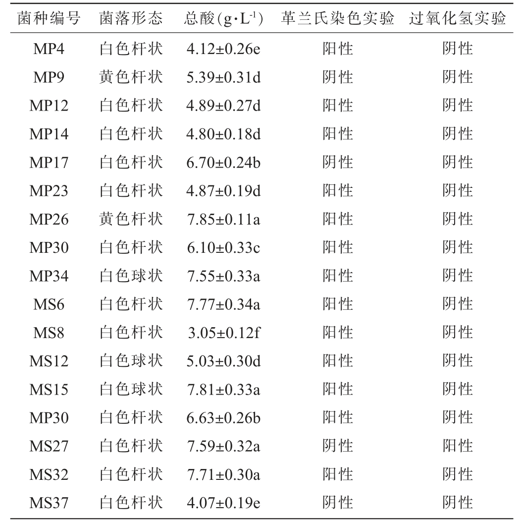 菌种编号 菌落形态 总酸(g·L-1) 革兰氏染色实验 过氧化氢实验MP4 MP9 MP12 MP14 MP17 MP23 MP26 MP30 MP34 MS6 MS8 MS12 MS15 MP30 MS27 MS32 MS37白色杆状黄色杆状白色杆状白色杆状白色杆状白色杆状黄色杆状白色杆状白色球状白色杆状白色杆状白色球状白色球状白色杆状白色杆状白色杆状白色杆状4.12±0.26e 5.39±0.31d 4.89±0.27d 4.80±0.18d 6.70±0.24b 4.87±0.19d 7.85±0.11a 6.10±0.33c 7.55±0.33a 7.77±0.34a 3.05±0.12f 5.03±0.30d 7.81±0.33a 6.63±0.26b 7.59±0.32a 7.71±0.30a 4.07±0.19e阳性阴性阳性阳性阴性阳性阳性阳性阳性阳性阳性阳性阳性阳性阴性阳性阴性阴性阴性阴性阴性阴性阴性阴性阴性阴性阴性阴性阴性阴性阴性阳性阴性阴性