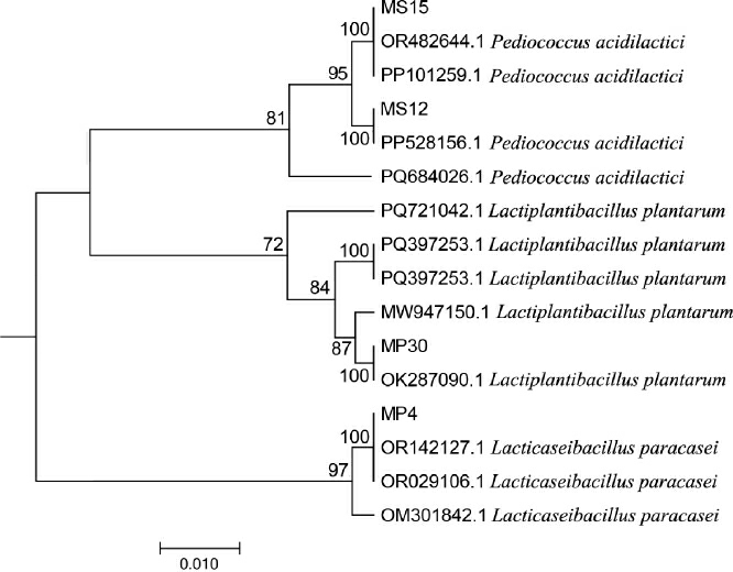 基于16S rRNA基因序列构建了4株优良乳酸菌菌株的系统发育树,结果见图1。由图1可知,菌株MP4与副干酪乳杆菌(Lacticaseibacillus paracasei)(OR142127.1)和(Lacticaseibacillus paracasei)(OR029106.1)聚类在一起,同源性为100%,被鉴定为副干酪乳杆菌(Lacticaseibacillus paracasei);菌株MP30与植物乳植杆菌(Lactiplantibacillusplantarum)(OK287090.1)聚类在一起,同源性为100%,被鉴定为植物乳植杆菌(Lactiplantibacillus plantarum);菌株MS12与乳酸片球菌(Pediococcus acidilactici)(PP528156.1)聚类在一起,同源性为100%,菌株MS15与Pediococcus acidilactici(OR482644.1)和Pediococcus acidilactici(PP101259.1)聚类在一起,同源性为100%,被鉴定为乳酸片球菌(Pediococcus acidilactici)。