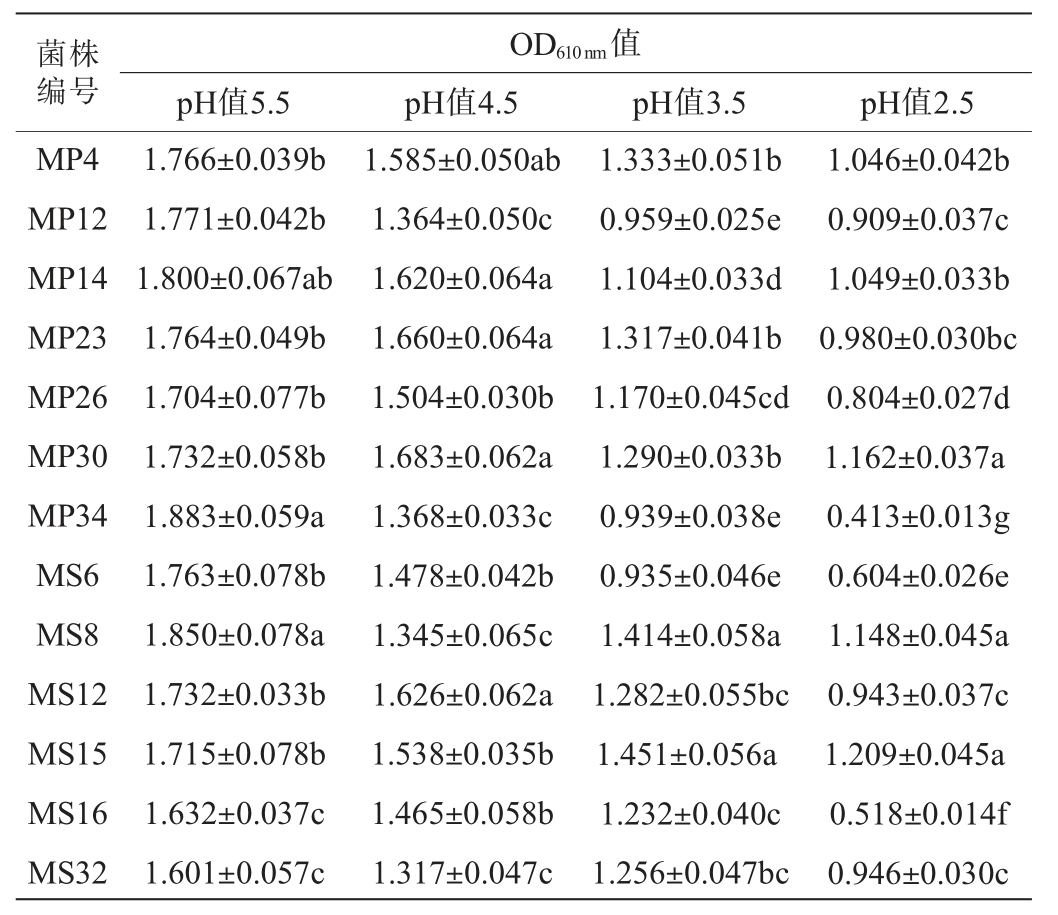 菌株编号MP4 MP12 MP14 MP23 MP26 MP30 MP34 MS6 MS8 MS12 MS15 MS16 MS32 OD610 nm值pH值5.5 pH值4.5 pH值3.5 pH值2.5 1.766±0.039b 1.771±0.042b 1.800±0.067ab 1.764±0.049b 1.704±0.077b 1.732±0.058b 1.883±0.059a 1.763±0.078b 1.850±0.078a 1.732±0.033b 1.715±0.078b 1.632±0.037c 1.601±0.057c 1.585±0.050ab 1.364±0.050c 1.620±0.064a 1.660±0.064a 1.504±0.030b 1.683±0.062a 1.368±0.033c 1.478±0.042b 1.345±0.065c 1.626±0.062a 1.538±0.035b 1.465±0.058b 1.317±0.047c 1.333±0.051b 0.959±0.025e 1.104±0.033d 1.317±0.041b 1.170±0.045cd 1.290±0.033b 0.939±0.038e 0.935±0.046e 1.414±0.058a 1.282±0.055bc 1.451±0.056a 1.232±0.040c 1.256±0.047bc 1.046±0.042b 0.909±0.037c 1.049±0.033b 0.980±0.030bc 0.804±0.027d 1.162±0.037a 0.413±0.013g 0.604±0.026e 1.148±0.045a 0.943±0.037c 1.209±0.045a 0.518±0.014f 0.946±0.030c