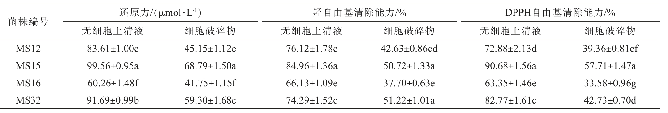 菌株编号 还原力/(μmol·L-1)无细胞上清液细胞破碎物 细胞破碎物羟自由基清除能力/%无细胞上清液DPPH自由基清除能力/%无细胞上清液 细胞破碎物MS12 MS15 MS16 MS32 83.61±1.00c 99.56±0.95a 60.26±1.48f 91.69±0.99b 45.15±1.12e 68.79±1.50a 41.75±1.15f 59.30±1.68c 76.12±1.78c 84.96±1.36a 66.13±1.09e 74.29±1.52c 42.63±0.86cd 50.72±1.33a 37.70±0.63e 51.22±1.01a 72.88±2.13d 90.68±1.56a 63.35±1.46e 82.77±1.61c 39.36±0.81ef 57.71±1.47a 33.58±0.96g 42.73±0.70d