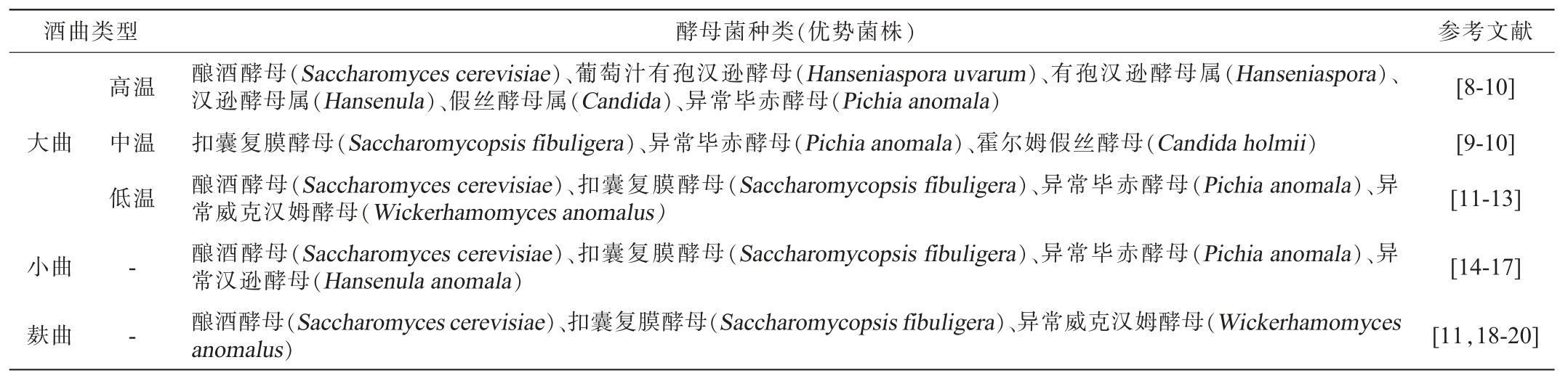 酒曲类型酵母菌种类(优势菌株)参考文献大曲小曲麸曲高温中温低温--酿酒酵母(Saccharomyces cerevisiae)、葡萄汁有孢汉逊酵母(Hanseniaspora uvarum)、有孢汉逊酵母属(Hanseniaspora)、汉逊酵母属(Hansenula)、假丝酵母属(Candida)、异常毕赤酵母(Pichia anomala)扣囊复膜酵母(Saccharomycopsis fibuligera)、异常毕赤酵母(Pichia anomala)、霍尔姆假丝酵母(Candida holmii)酿酒酵母(Saccharomyces cerevisiae)、扣囊复膜酵母(Saccharomycopsis fibuligera)、异常毕赤酵母(Pichia anomala)、异常威克汉姆酵母(Wickerhamomyces anomalus)酿酒酵母(Saccharomyces cerevisiae)、扣囊复膜酵母(Saccharomycopsis fibuligera)、异常毕赤酵母(Pichia anomala)、异常汉逊酵母(Hansenula anomala)酿酒酵母(Saccharomyces cerevisiae)、扣囊复膜酵母(Saccharomycopsis fibuligera)、异常威克汉姆酵母(Wickerhamomyces anomalus)[8-10] [9-10] [11-13] [14-17] [11,18-20]