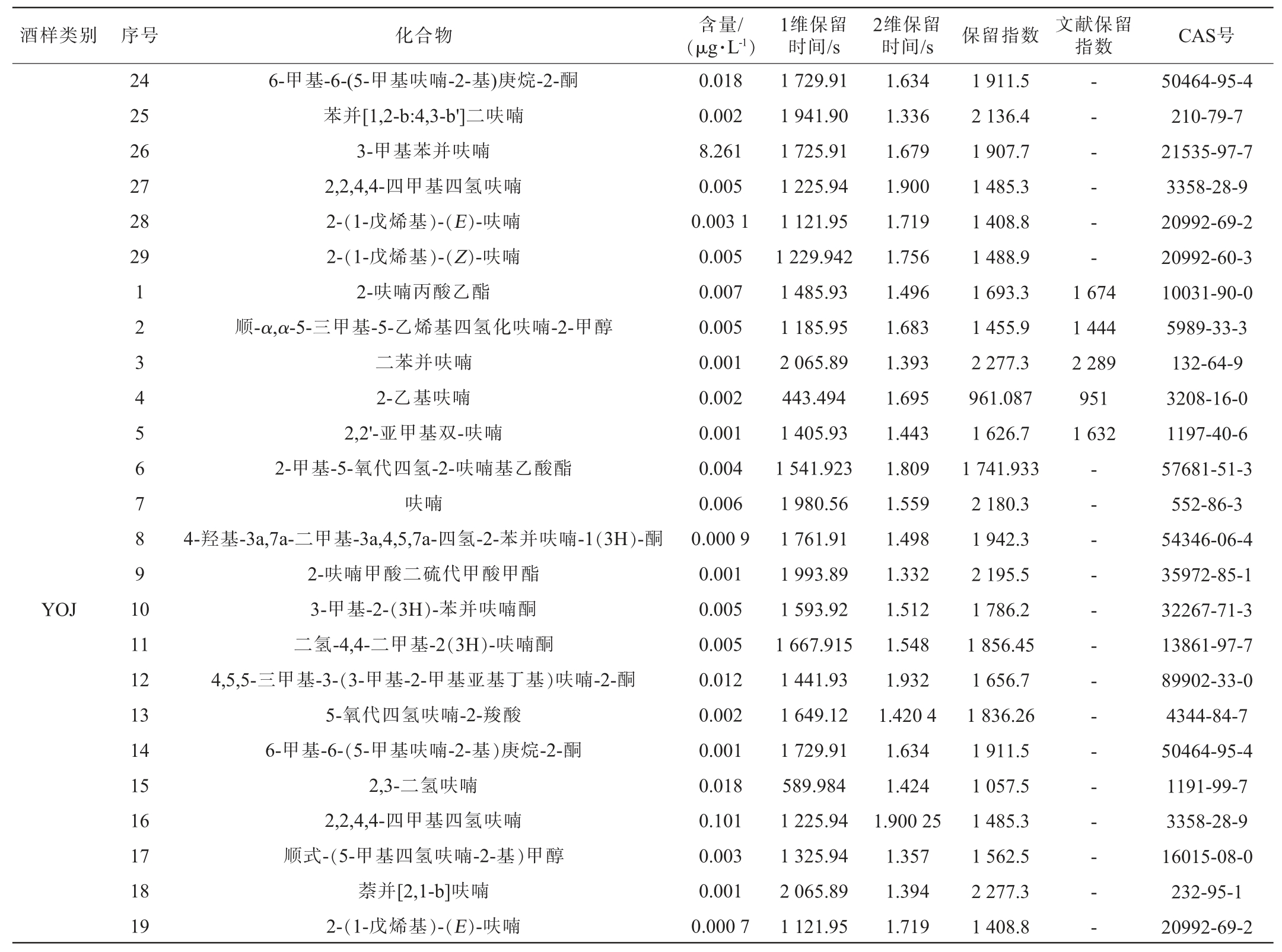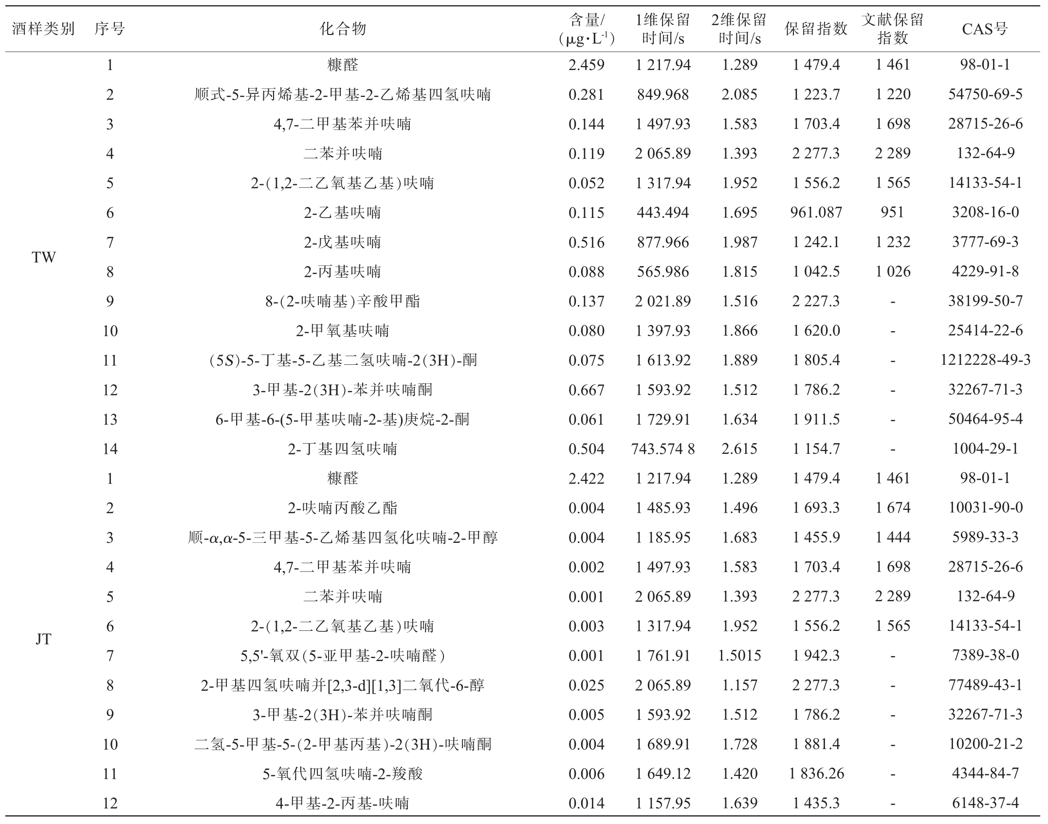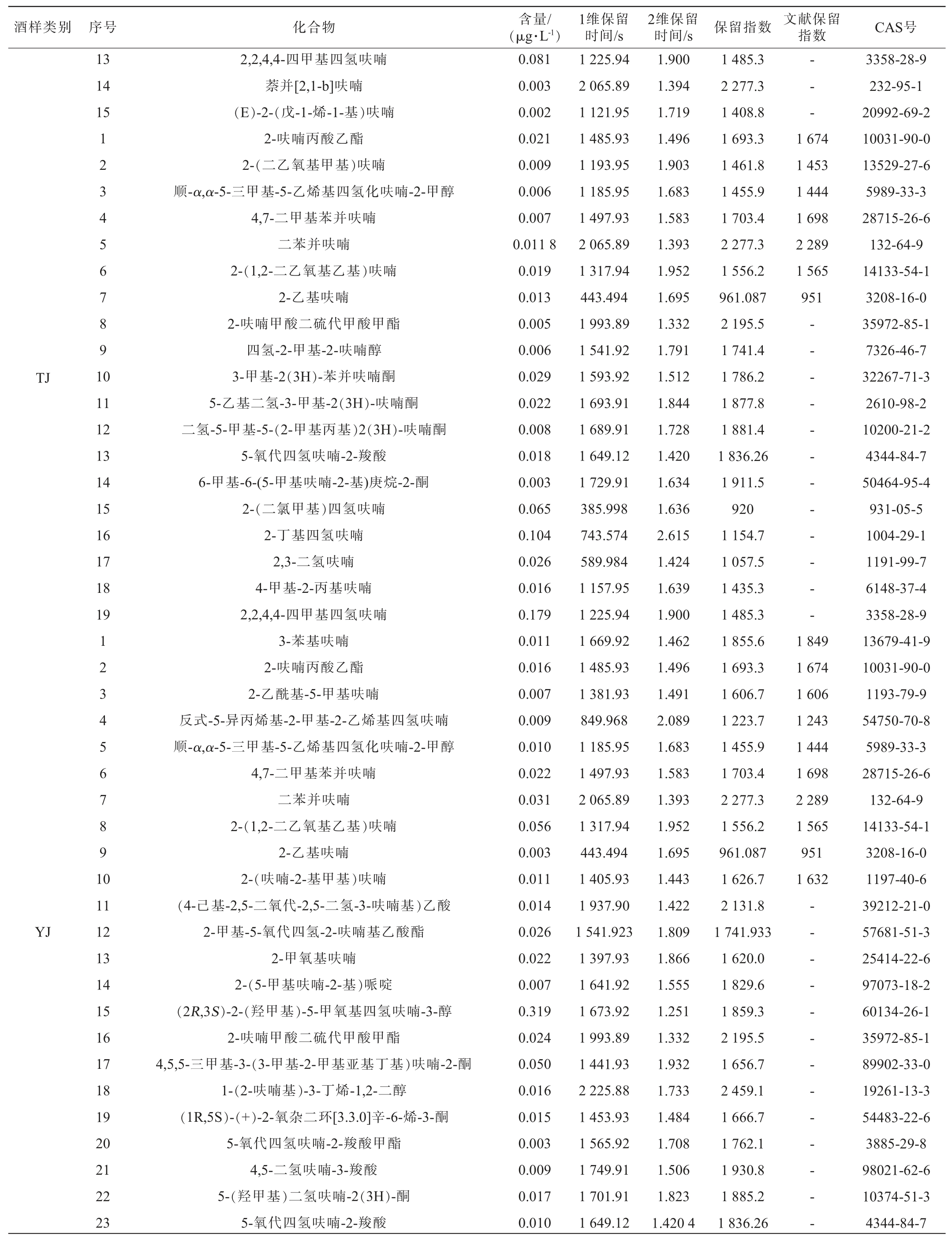 酒样类别 序号化合物含量/(μg·L-1)1维保留时间/s 2维保留时间/s保留指数 文献保留指数CAS号TW 1234567891 0 1 461 1 220 1 698 2 289 1 565 951 1 232 1 026 11 12 13 14------JT 1234567891 0 1 461 1 674 1 444 1 698 2 289 1 565 11 12糠醛顺式-5-异丙烯基-2-甲基-2-乙烯基四氢呋喃4,7-二甲基苯并呋喃二苯并呋喃2-(1,2-二乙氧基乙基)呋喃2-乙基呋喃2-戊基呋喃2-丙基呋喃8-(2-呋喃基)辛酸甲酯2-甲氧基呋喃(5S)-5-丁基-5-乙基二氢呋喃-2(3H)-酮3-甲基-2(3H)-苯并呋喃酮6-甲基-6-(5-甲基呋喃-2-基)庚烷-2-酮2-丁基四氢呋喃糠醛2-呋喃丙酸乙酯顺-α,α-5-三甲基-5-乙烯基四氢化呋喃-2-甲醇4,7-二甲基苯并呋喃二苯并呋喃2-(1,2-二乙氧基乙基)呋喃5,5'-氧双(5-亚甲基-2-呋喃醛)2-甲基四氢呋喃并[2,3-d] [1,3] 二氧代-6-醇3-甲基-2(3H)-苯并呋喃酮二氢-5-甲基-5-(2-甲基丙基)-2(3H)-呋喃酮5-氧代四氢呋喃-2-羧酸4-甲基-2-丙基-呋喃2.459 0.281 0.144 0.119 0.052 0.115 0.516 0.088 0.137 0.080 0.075 0.667 0.061 0.504 2.422 0.004 0.004 0.002 0.001 0.003 0.001 0.025 0.005 0.004 0.006 0.014 1 217.94 849.968 1 497.93 2 065.89 1 317.94 443.494 877.966 565.986 2 021.89 1 397.93 1 613.92 1 593.92 1 729.91 743.574 8 1 217.94 1 485.93 1 185.95 1 497.93 2 065.89 1 317.94 1 761.91 2 065.89 1 593.92 1 689.91 1 649.12 1 157.95 1.289 2.085 1.583 1.393 1.952 1.695 1.987 1.815 1.516 1.866 1.889 1.512 1.634 2.615 1.289 1.496 1.683 1.583 1.393 1.952 1.5015 1.157 1.512 1.728 1.420 1.639 1 479.4 1 223.7 1 703.4 2 277.3 1 556.2 961.087 1 242.1 1 042.5 2 227.3 1 620.0 1 805.4 1 786.2 1 911.5 1 154.7 1 479.4 1 693.3 1 455.9 1 703.4 2 277.3 1 556.2 1 942.3 2 277.3 1 786.2 1 881.4 1 836.26 1 435.3------98-01-1 54750-69-5 28715-26-6 132-64-9 14133-54-1 3208-16-0 3777-69-3 4229-91-8 38199-50-7 25414-22-6 1212228-49-3 32267-71-3 50464-95-4 1004-29-1 98-01-1 10031-90-0 5989-33-3 28715-26-6 132-64-9 14133-54-1 7389-38-0 77489-43-1 32267-71-3 10200-21-2 4344-84-7 6148-37-4