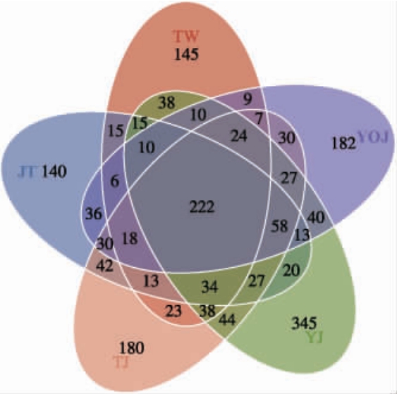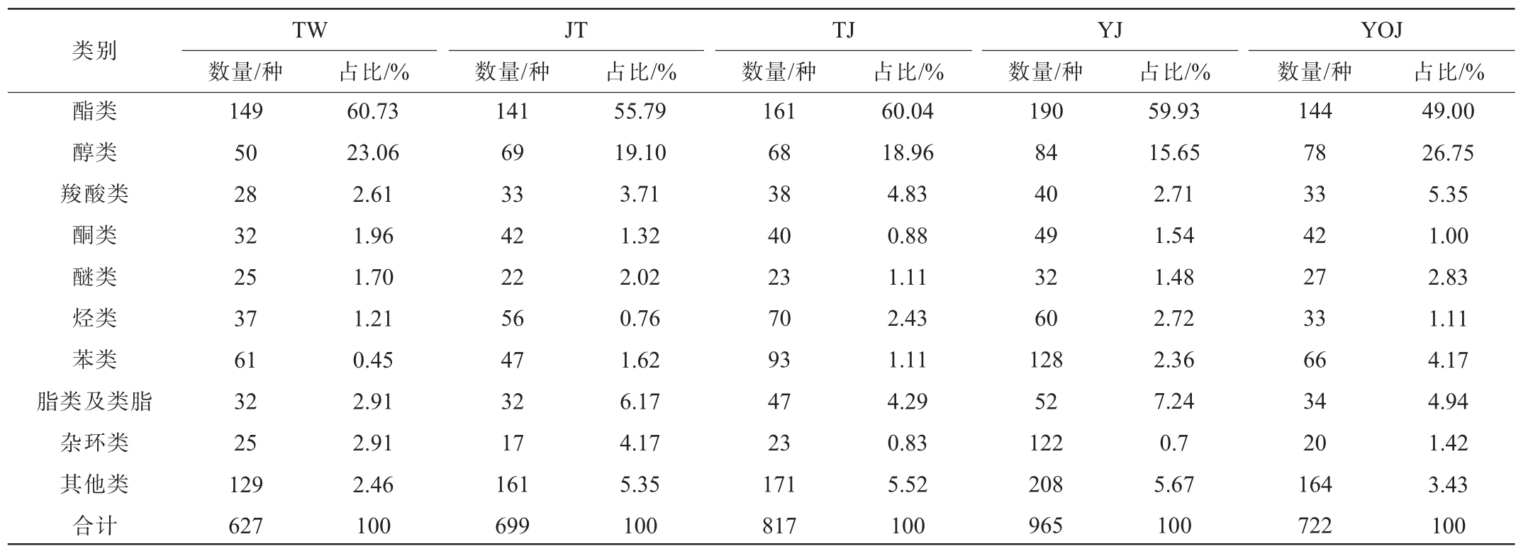 在压排期不同质量等级文王贡酒的5个样品中共检测到3 830个色谱峰,各类别挥发性成分的数量及占比见表1,各类别挥发性成分数量韦恩图见图2。 由表1可知,在5个不同质量等级压排期文王贡酒中共鉴定出可信度较高的挥发性组分1 214种,样品TW、JT、TJ、YJ、YOJ中分别鉴定出挥发性组分627种、699种、817种、965种和722种。