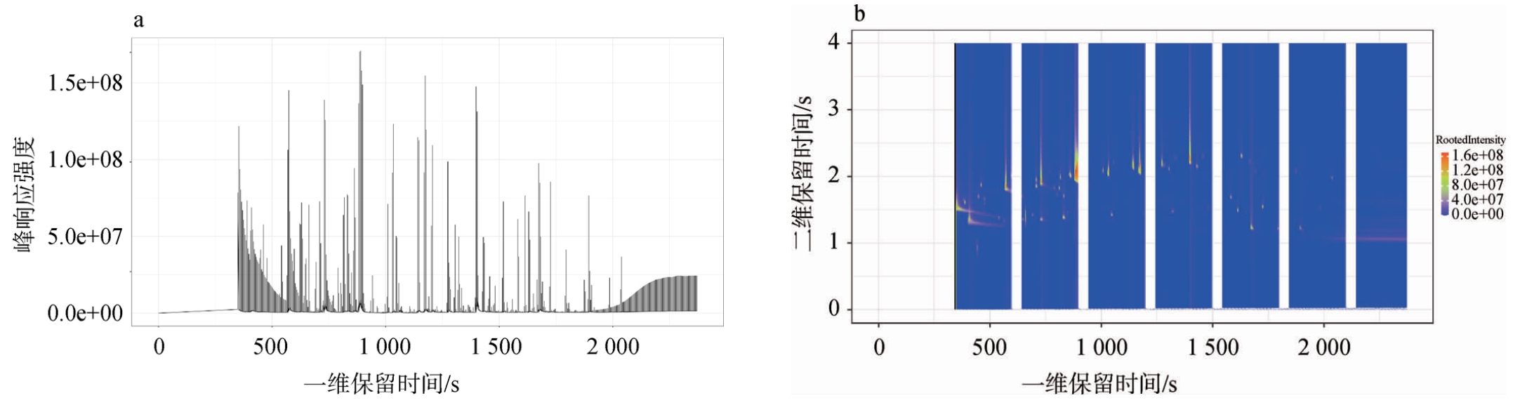 Fig. 1 1-dimentional (a) and 2-dimentional (b) total ion chromatogram of volatile components in Baijiu sample TW analysis by HS-SPME-GC×GC-TOF-MS