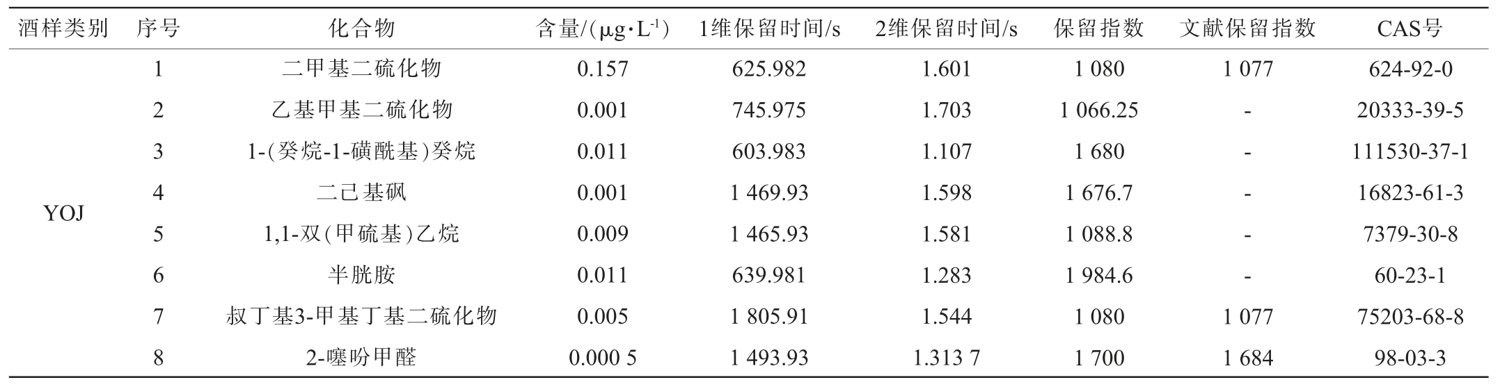 酒样类别 序号化合物含量/(μg·L-1) 1维保留时间/s2维保留时间/s保留指数文献保留指数CAS号1 077 YOJ 12345678二甲基二硫化物乙基甲基二硫化物1-(癸烷-1-磺酰基)癸烷二己基砜1,1-双(甲硫基)乙烷半胱胺叔丁基3-甲基丁基二硫化物2-噻吩甲醛0.157 0.001 0.011 0.001 0.009 0.011 0.005 0.000 5 625.982 745.975 603.983 1 469.93 1 465.93 639.981 1 805.91 1 493.93 1.601 1.703 1.107 1.598 1.581 1.283 1.544 1.313 7 1 080 1 066.25 1 680 1 676.7 1 088.8 1 984.6 1 080 1 700-----1 077 1 684 624-92-0 20333-39-5 111530-37-1 16823-61-3 7379-30-8 60-23-1 75203-68-8 98-03-3