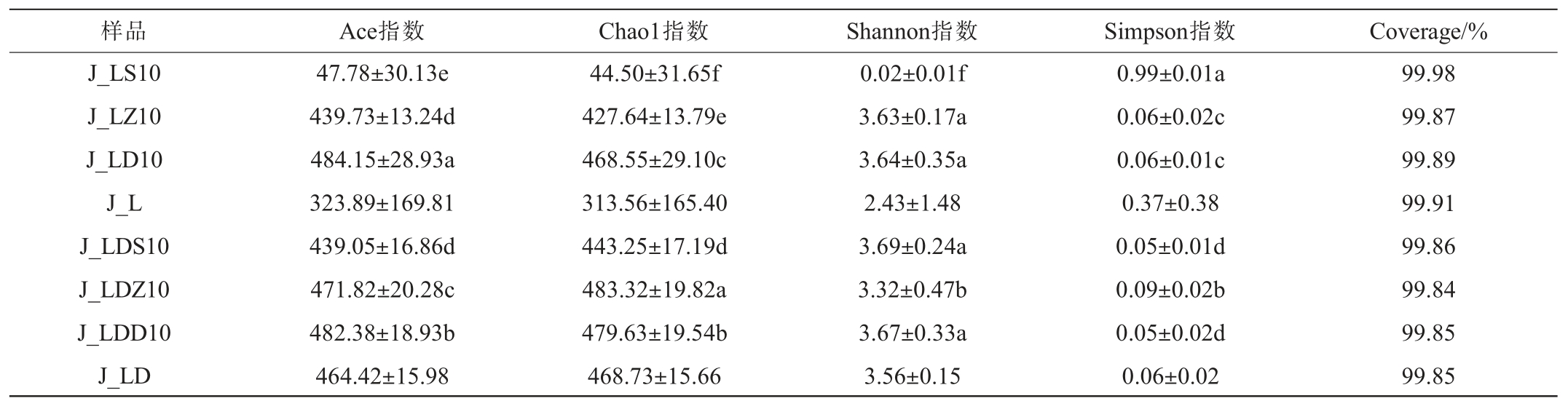 样品Ace指数Chao1指数Shannon指数Simpson指数Coverage/%J_LS10 J_LZ10 J_LD10 J_L J_LDS10 J_LDZ10 J_LDD10 J_LD 47.78±30.13e 439.73±13.24d 484.15±28.93a 323.89±169.81 439.05±16.86d 471.82±20.28c 482.38±18.93b 464.42±15.98 44.50±31.65f 427.64±13.79e 468.55±29.10c 313.56±165.40 443.25±17.19d 483.32±19.82a 479.63±19.54b 468.73±15.66 0.02±0.01f 3.63±0.17a 3.64±0.35a 2.43±1.48 3.69±0.24a 3.32±0.47b 3.67±0.33a 3.56±0.15 0.99±0.01a 0.06±0.02c 0.06±0.01c 0.37±0.38 0.05±0.01d 0.09±0.02b 0.05±0.02d 0.06±0.02 99.98 99.87 99.89 99.91 99.86 99.84 99.85 99.85