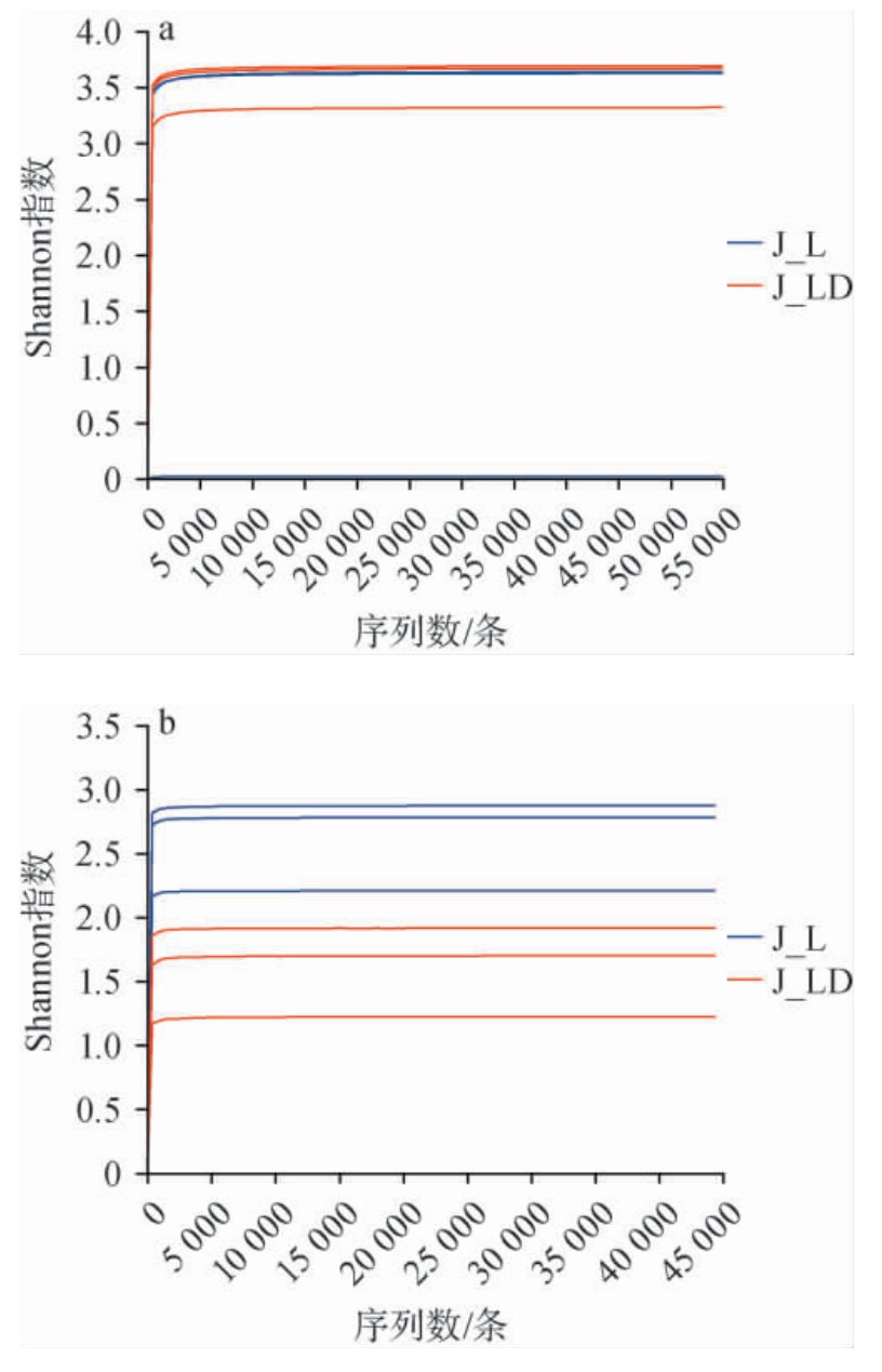 图2 基于Shannon指数泸州地区不同酒厂窖泥中细菌(a)和真菌(b)菌群的稀释曲线