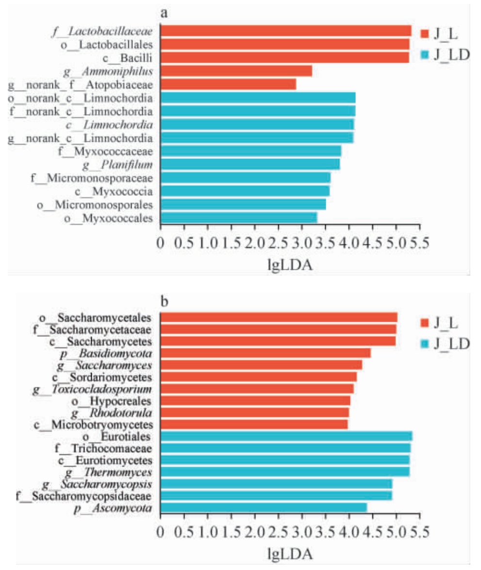 为精准识别并量化影响窖泥微生态差异的关键微生物类群,采用线性判别分析效应大小(linear discriminant analysis effect size,LEfSe)方法分析泸州地区不同酒厂窖泥样品中微生物的主要差异类群,结果见图6。 由图6a可知,从两个酒厂窖泥样品中共检测出15个差异细菌(线性判别分析(linear discriminant analysis,LDA)>2),在纲、目、科水平上分别检出3种、4种、4种差异微生物。在属水平上,J-L酒厂窖泥样品中的差异细菌菌群为氨嗜菌属(Ammoniphilus)和norank_f__Atopobiaceae,其中,Ammoniphilus实际参与了窖泥铵态氮的消耗与转化,维持窖泥中的氮素平衡[37]。J-LD酒厂窖泥样品中的差异细菌菌群为扁平丝菌属(Planifilum)和norank_f__c__Limnochordia。由图6b可知,从两个酒厂窖泥样品中共检测出17个差异真菌(LDA>4),在纲、目、科水平上分别检出4、3、3种差异微生物。在门、属水平上,J-L酒厂窖泥样品中的差异真菌菌群为酵母属(Saccharomyces)、红酵母属(Rhodotorula)、毒枝孢属(Toxicocladosporium)、Basidiomycota。 J-LD酒厂窖泥样品中的差异真菌菌群为Ascomycota、Thermomyces、复膜孢酵母属(Saccharomycopsis)。 酵母菌在发酵过程有助于维持窖泥中微生物群落的稳定,可进一步提高酒制品品质[38]。