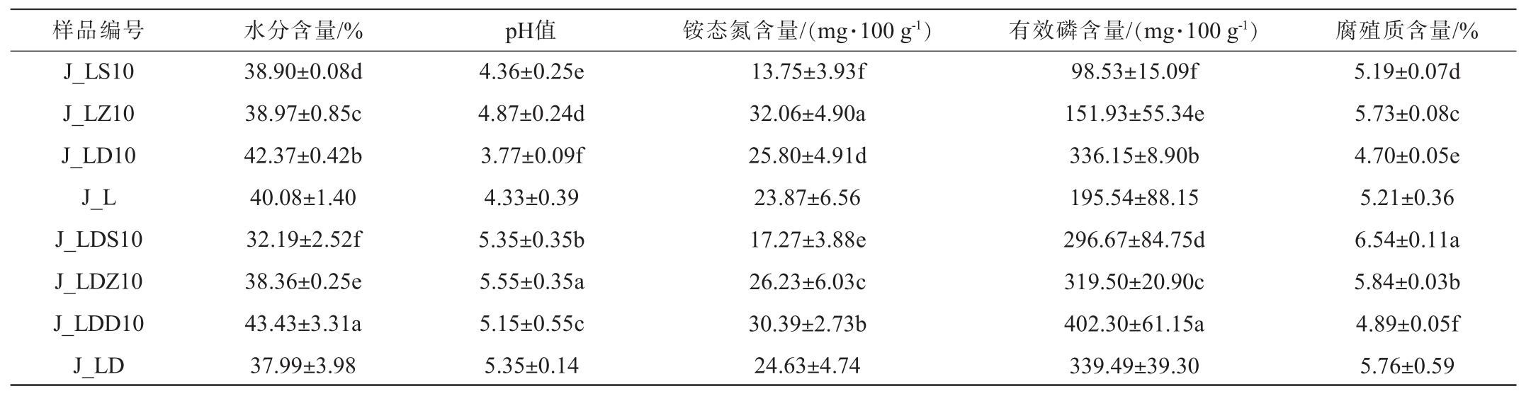 样品编号水分含量/%pH值铵态氮含量/(mg·100 g-1)有效磷含量/(mg·100 g-1)腐殖质含量/%J_LS10 J_LZ10 J_LD10 J_L J_LDS10 J_LDZ10 J_LDD10 J_LD 38.90±0.08d 38.97±0.85c 42.37±0.42b 40.08±1.40 32.19±2.52f 38.36±0.25e 43.43±3.31a 37.99±3.98 4.36±0.25e 4.87±0.24d 3.77±0.09f 4.33±0.39 5.35±0.35b 5.55±0.35a 5.15±0.55c 5.35±0.14 13.75±3.93f 32.06±4.90a 25.80±4.91d 23.87±6.56 17.27±3.88e 26.23±6.03c 30.39±2.73b 24.63±4.74 98.53±15.09f 151.93±55.34e 336.15±8.90b 195.54±88.15 296.67±84.75d 319.50±20.90c 402.30±61.15a 339.49±39.30 5.19±0.07d 5.73±0.08c 4.70±0.05e 5.21±0.36 6.54±0.11a 5.84±0.03b 4.89±0.05f 5.76±0.59