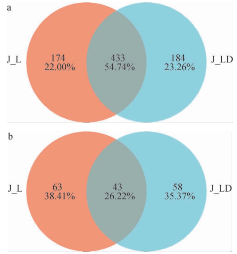 为直观展示不同酒厂窖泥微生物群落中操作分类单元(operational taxonomic unit,OTU)的共有与特有情况,绘制不同酒厂窖泥样品微生物菌群OTU韦恩图,结果见图3。由图3a可知,两个酒厂细菌OTU总数为791个,其中共有433个,J_L酒厂窖泥独有174个,J_LD酒厂窖泥独有184个;由图3b可知,两个酒厂真菌OTU总数为164个,其中共有43个,J_L酒厂窖泥独有63个,J_LD酒厂窖泥独有58个。由此可知,不同酒厂窖泥之间微生物群落结构存在差异。